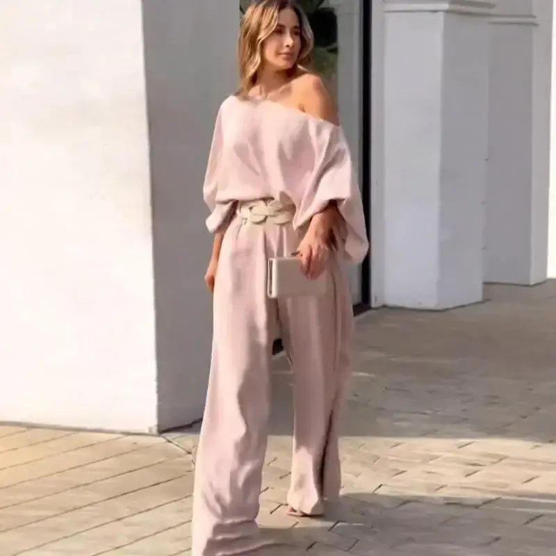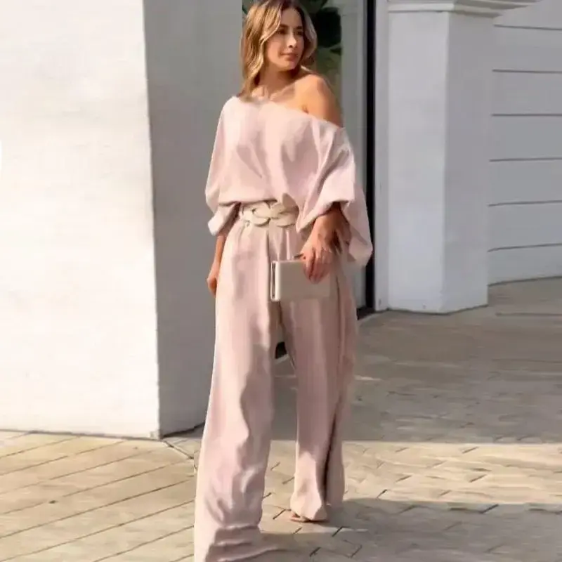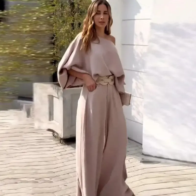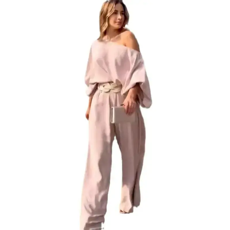 5. The 2026 summer new off-the-shoulder lantern-sleeve loose top set and wide-leg pants for European and American foreign trade are irregular