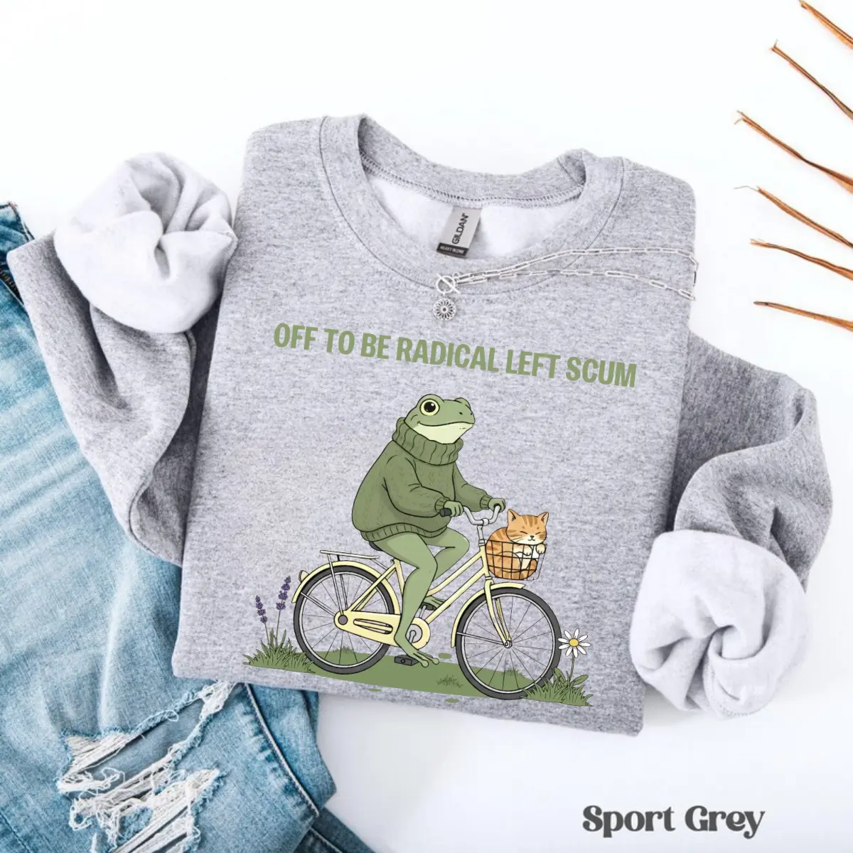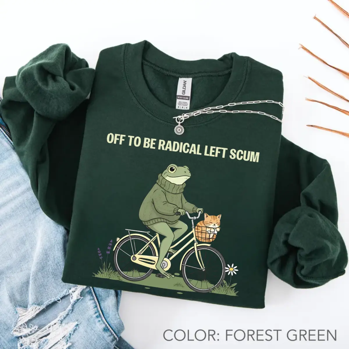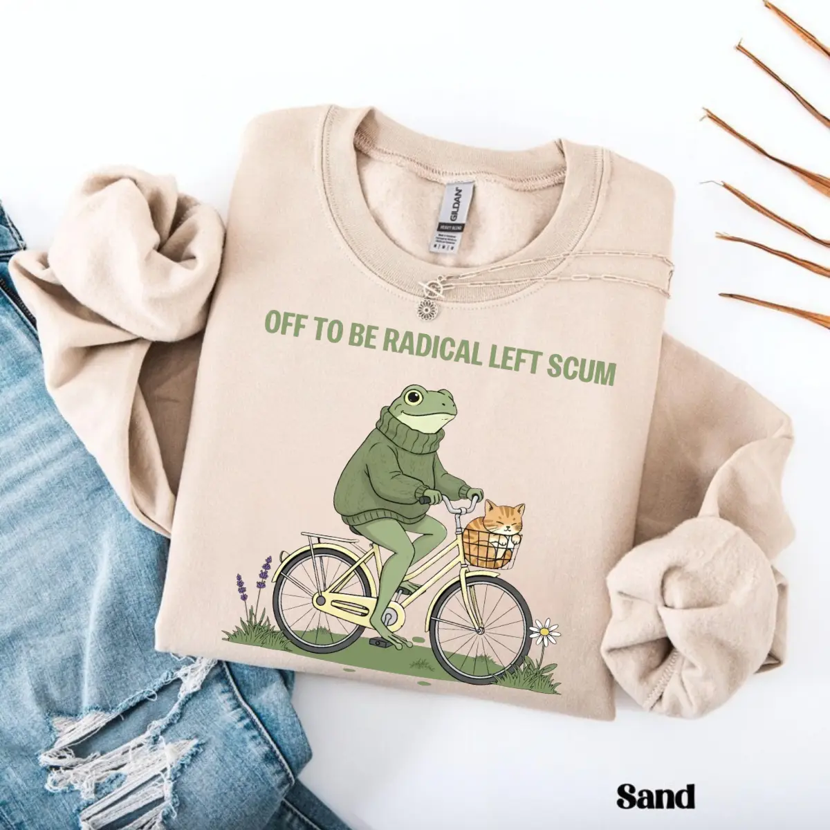 Make a dapper and unforgettable statement for your values with our "Off To Be Radical Left Scum" sweatshirt, the ultimate anthem for those who stand for community care and resistance with a touch of whimsical charm. This design features a high-energy, hand-drawn illustration of a dapper green frog in a cozy turtleneck sweater, pedaling a bicycle with a cute orange tabby cat tucked into the front basket. The bold, cream-colored typography delivers a defiant and ironic message that perfectly captures that "unapologetically progressive" energy. Crafted for a soft and relaxed fit, it provides signature comfort that stays cozy whether you are headed to a local rally, a community garden, or just making a dapper statement in your daily rotation. Grab this trendy progressive graphic today and let your wardrobe reflect your dapper spirit of solidarity.