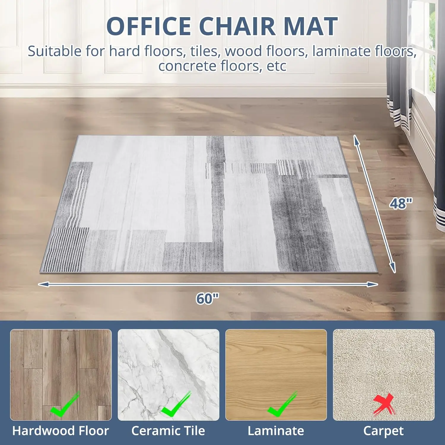 ·Chair Mat for Hardwood Floor: This carpet chair mat is made from loop velvet fabric, which gives it a smooth and sturdy surface; it measures 48" x 60" and is 0.15" thick; protects hardwood floors while also reducing damage from sliding chair wheels