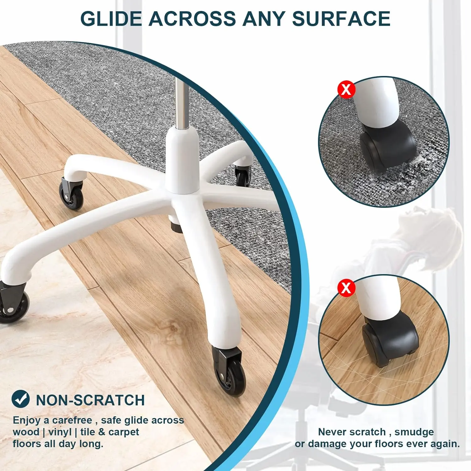 Upgrade your office chair with this set of 5 heavy-duty rubber chair casters, designed to replace traditional office chair mats and provide a smooth rolling experience on both hardwood floors and carpets.