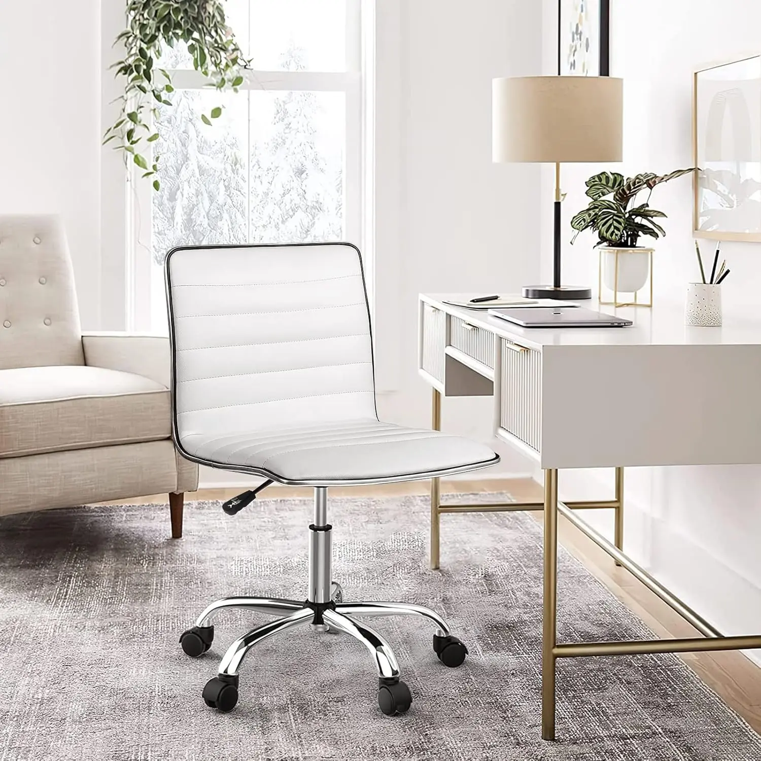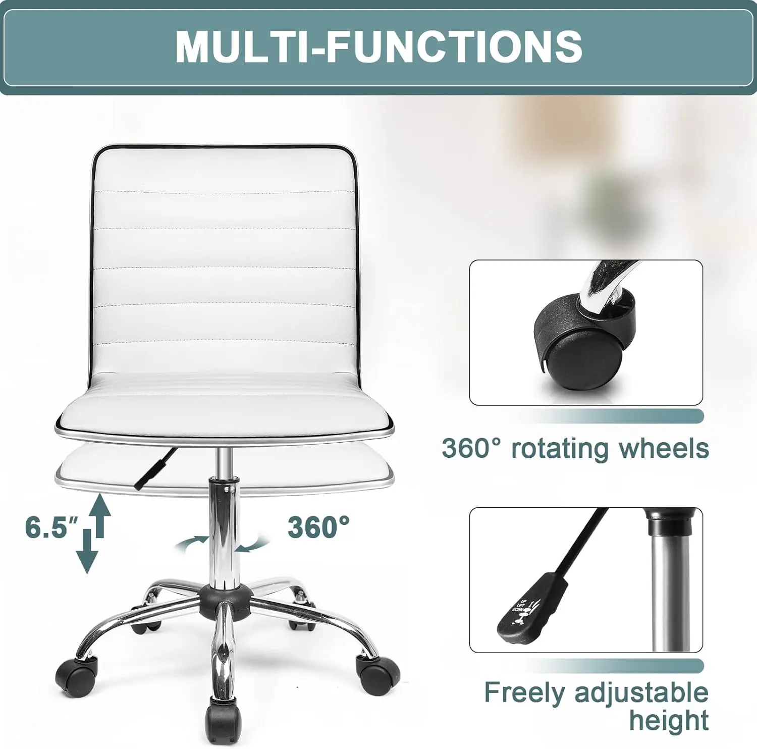 PUKAMI Office Desk Chair, Adjustable Task Chair, Low Back Faux Leather Ribbed Swivel Chair, Armless Home Computer Chair Retro with Wheels, Vanity Chair