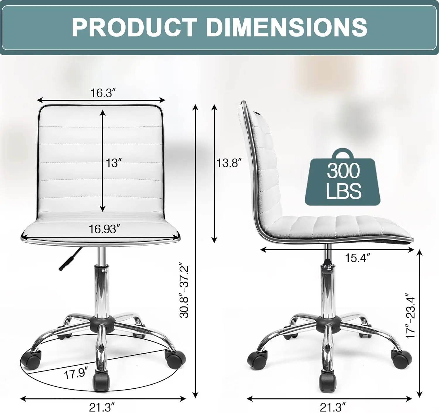 ·【Safety Task Chair】- BIFMA certified armless office chair with 5-star leg base and 360 degree swivel wheels,running smoothly on floor . Adjustable seat height: 17.0 inches -23.4 inches;seating area dimension: 15.4 inches x 16.9 inches (W X D);backrest dimension: 16.9 inches x 13.8 inches (W X H).