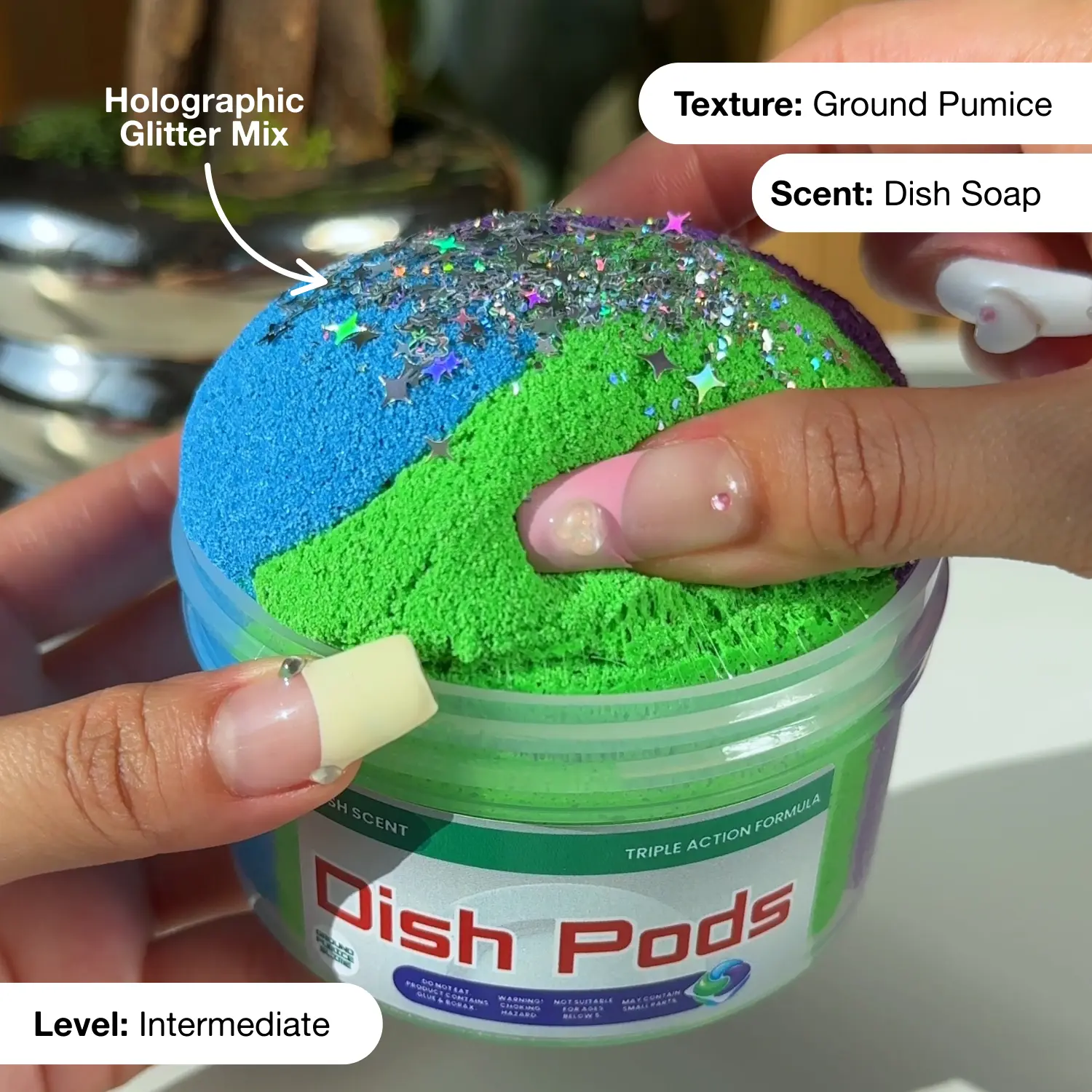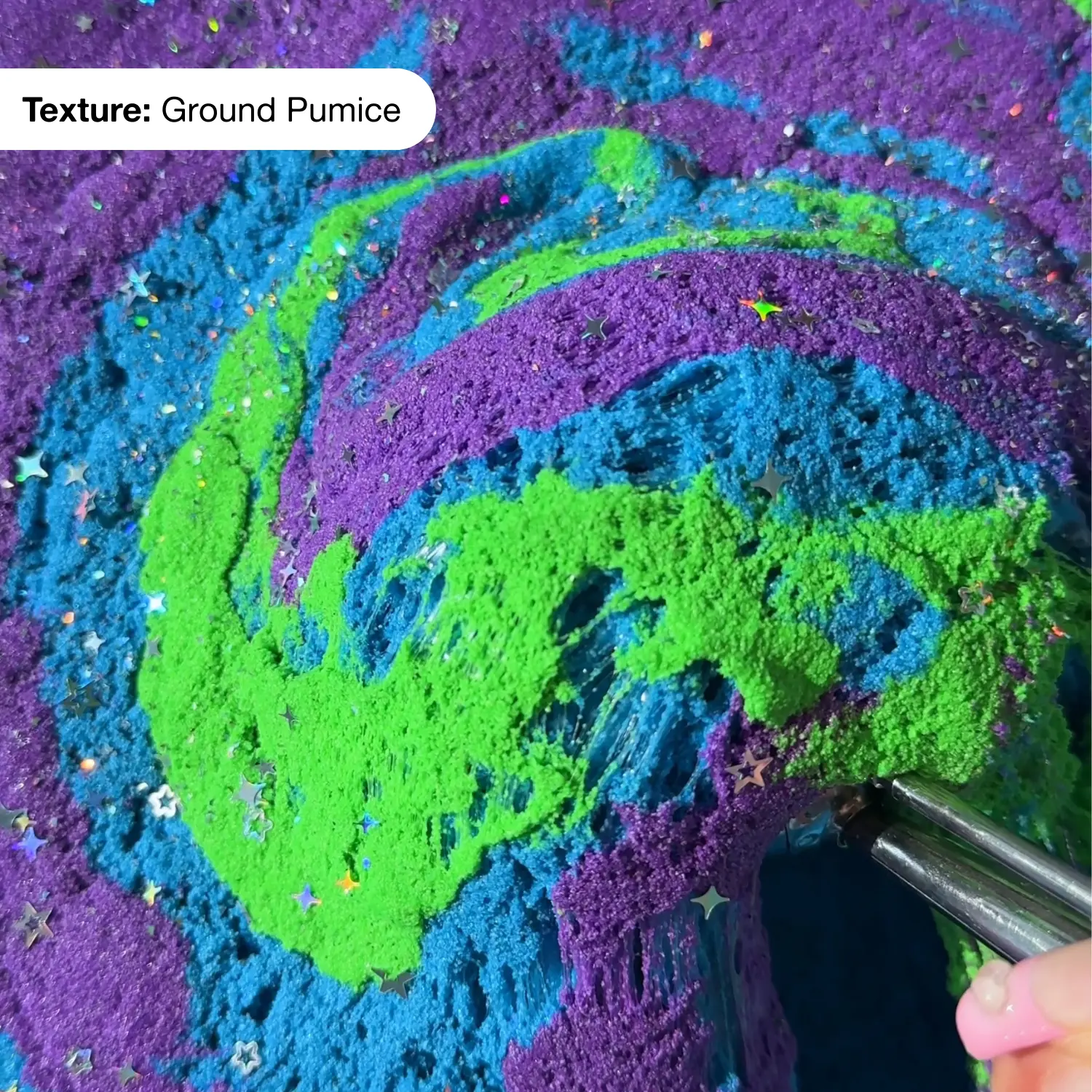 ·Notes: Ground pumice slimes may have slight fall out if ripped aggressively. Because of the high ratio, they can dry out faster than other textures. Limit play to 10 minutes at a time. If it becomes dry, mix in clear slime to refresh it.
