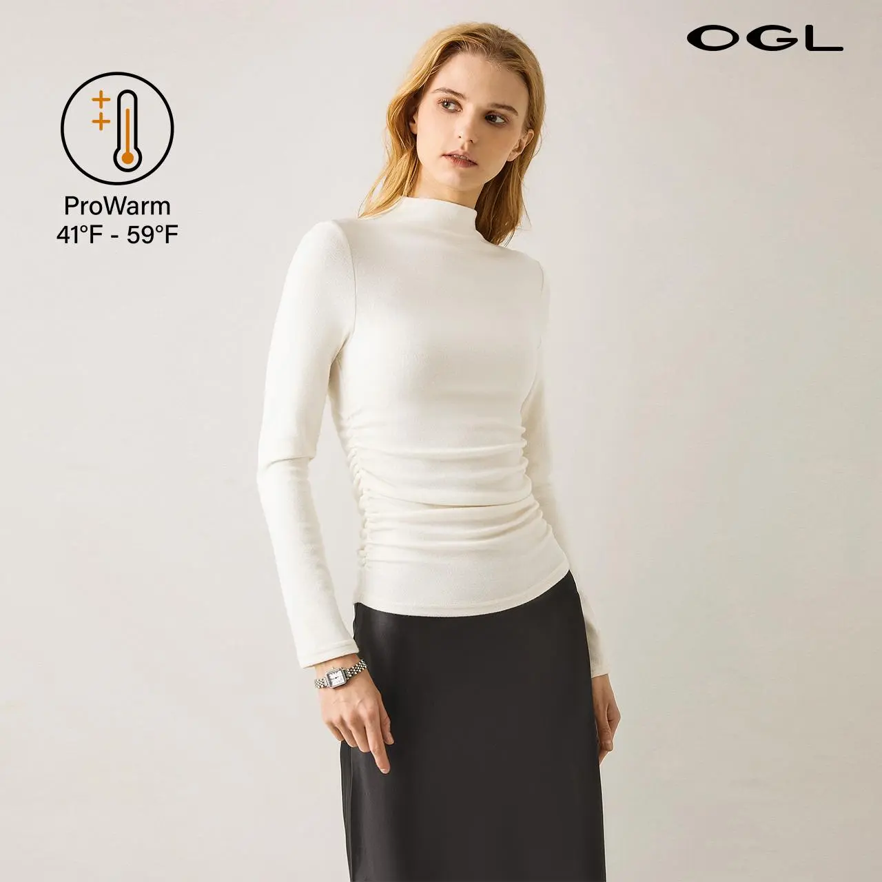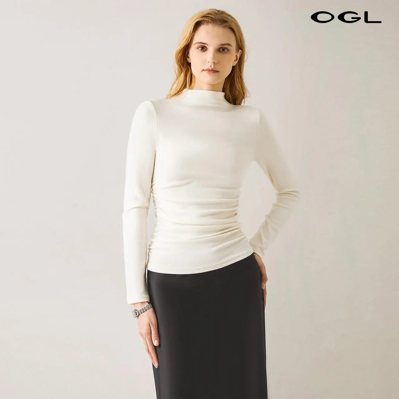 I just love a simple pullover shirt, but this has a four-way stretch, which hugs your whole body and brings out all your beautiful details. The Marc neck and the rushing makes a simple shirt, beautiful and sexy for simple casual day. I just love it.