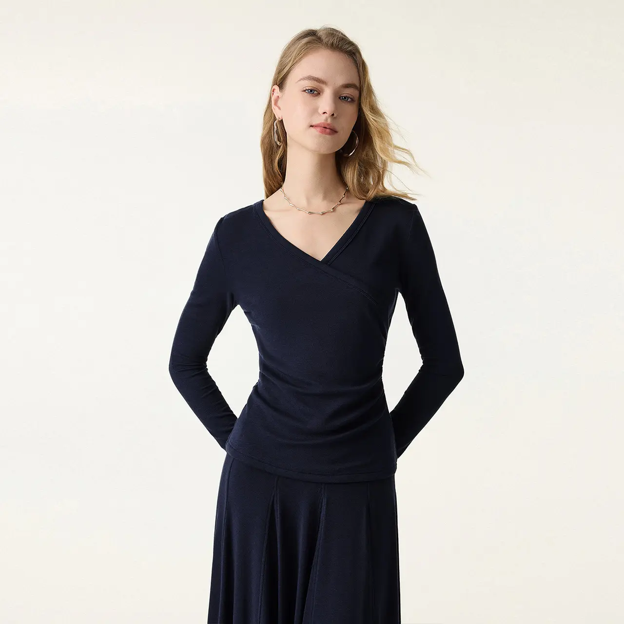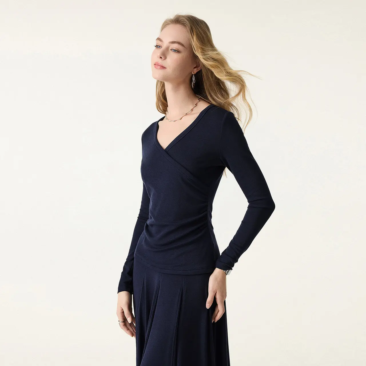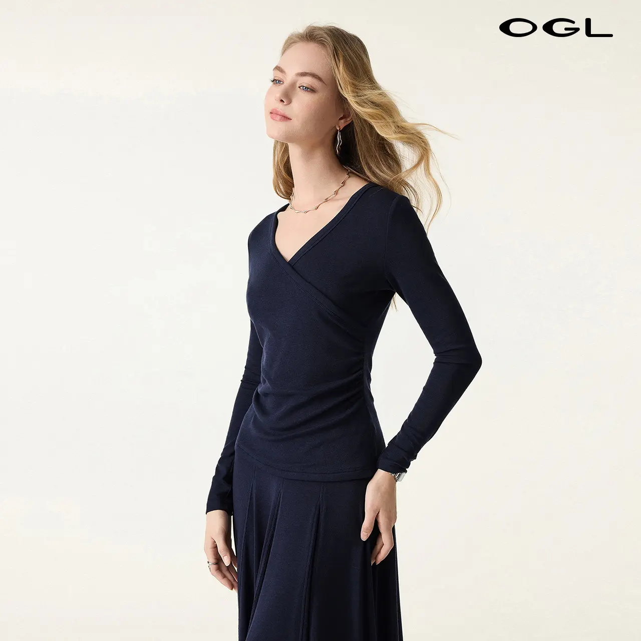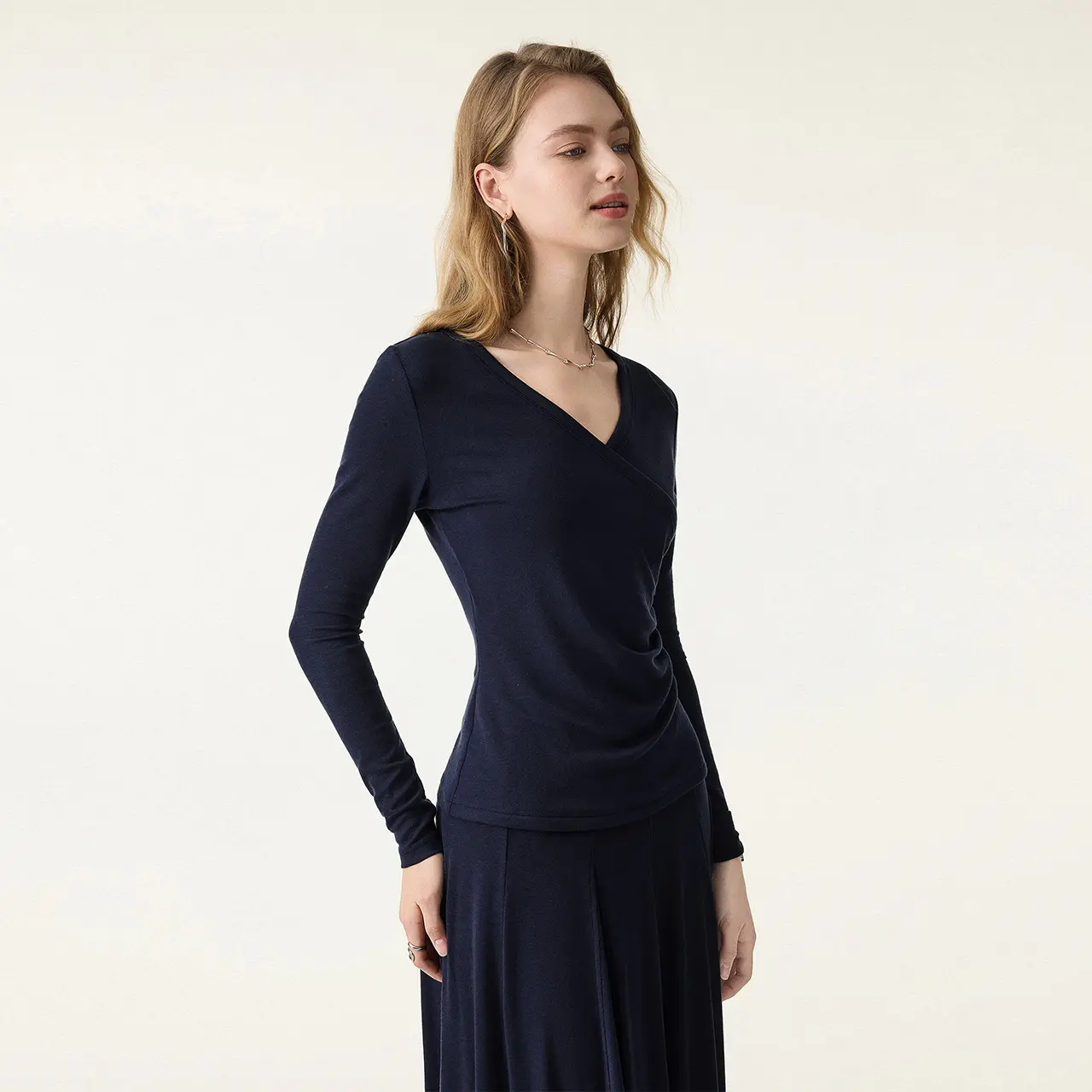5. OGL Lyocell Wool Surplice Ruched Long Sleeve Top - Elegant V-Neck Design for Comfort and Style SpringStatements