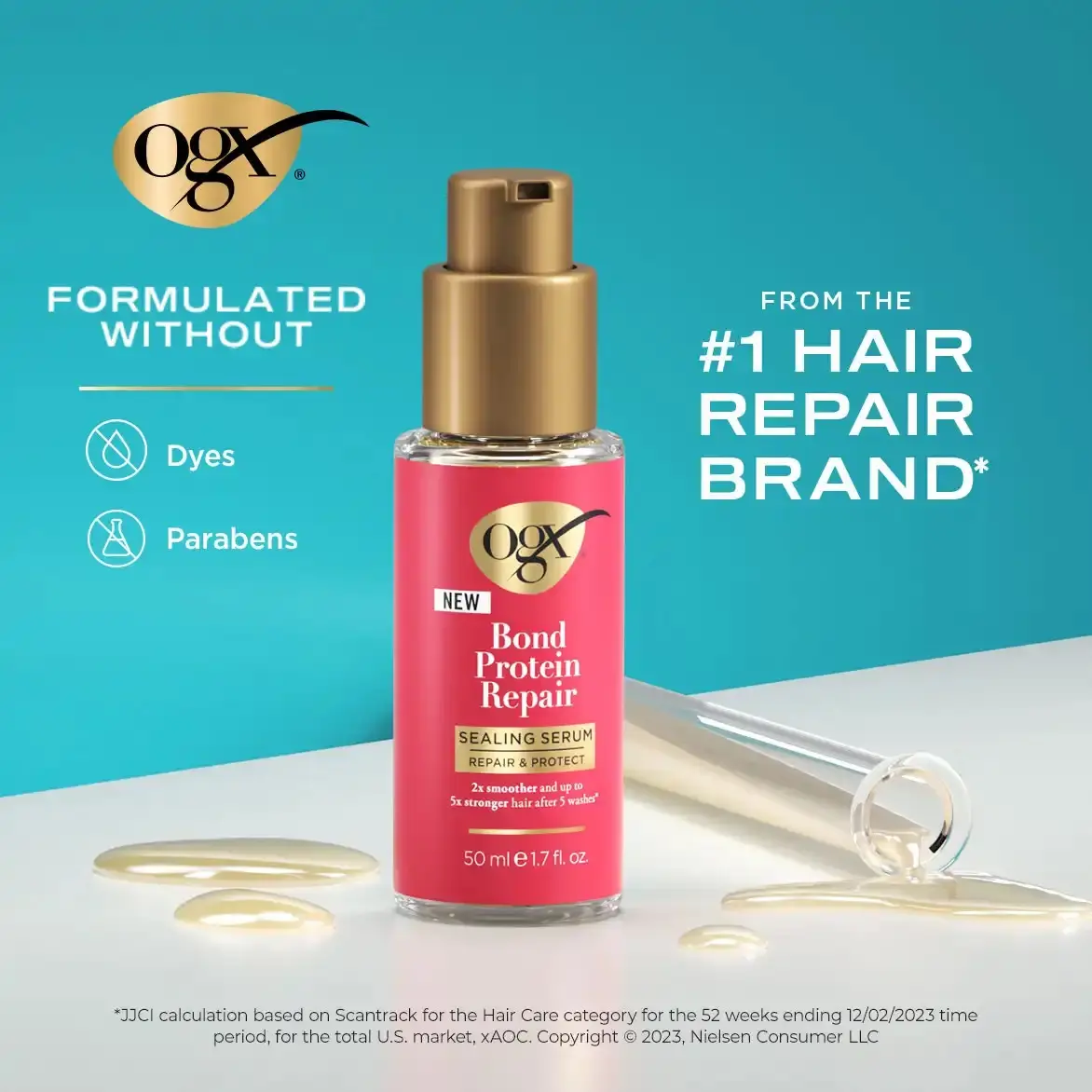 Bond Protein Repair Sealing Serum: Seal the deal for 80% smoother hair* with this Bond Protein Repair Sealing Serum. *With use of OGX® Bond Protein Repair System of Shampoo, Conditioner, and Sealing Serum, versus untreated damaged hair