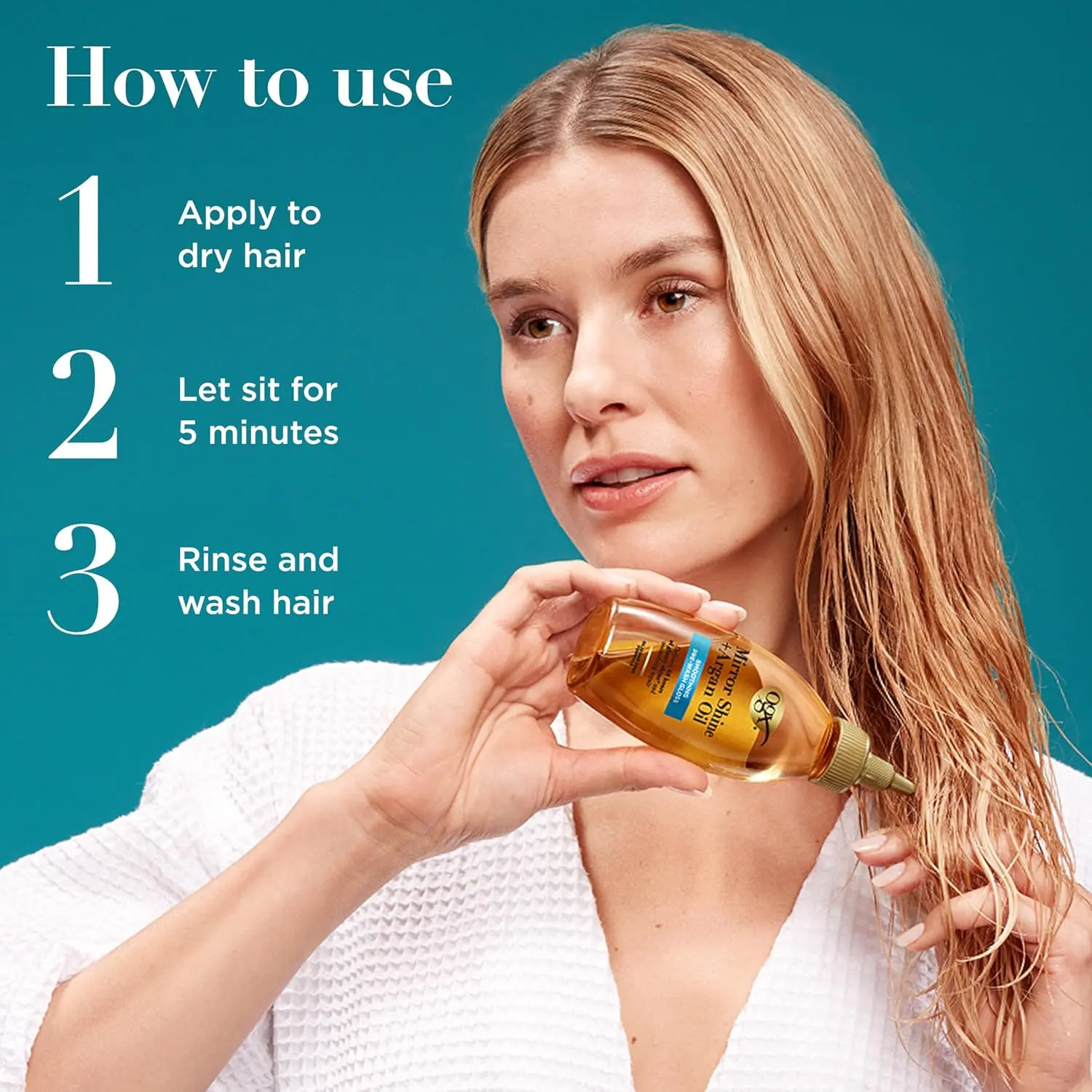 Apply generously to dry hair from shaft to ends. Let sit for 5 minutes then rinse hair thoroughly. Follow with your favorite OGX shampoo and conditioner. For a deeper treatment, leave on for longer. *when used with OGX shampoo and conditioner **when used with OGX shampoo and conditioner vs non-conditioning shampoo ***Mends up to 40% of split ends when used with OGX shampoo and conditioner