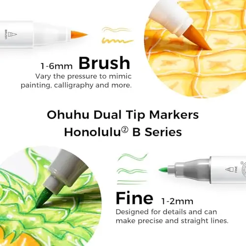 ·BRUSH & FINE, DOUBLE-TIP, DOUBLE THE FUN: Widen your artistic horizons with the dual-tip marker design! Choose the brush tip for sweeping, calligraphic strokes or the fine tip for details. What's more, now Ohuhu replacement brush tips is available, so you can easily replace the worn-out tips to ensure consistent and precise lines whenever you create. The only limit is your imagination