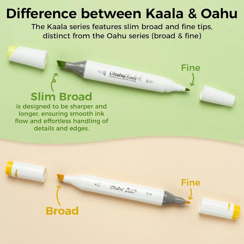 Ohuhu Kaala alcohol markers feature a distinctive Slim Broad tip instead of the Chisel tip of Oahu. The Slim Broad tip is longer, thinner, and sharper than regular chisel tip, making it more flexible for drawing and coloring. Ideal for large area color coverage and creating precise lines.