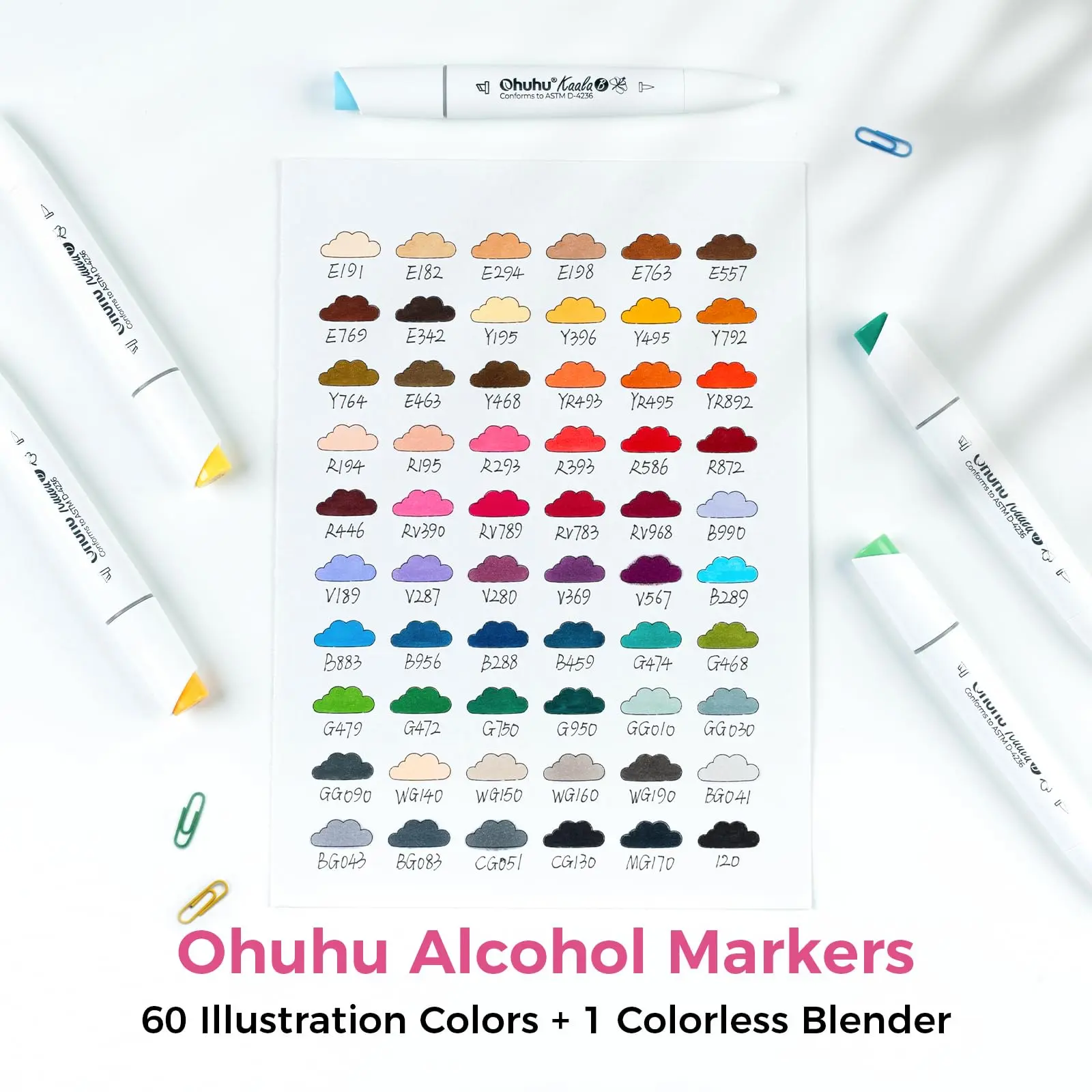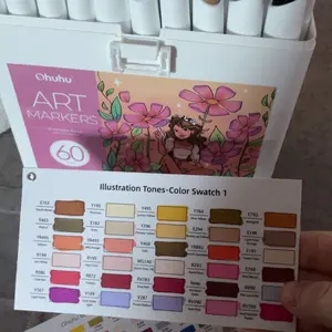 60 Vibrant Markers, 1 Beautiful Carrying Case, 1 Plastic Sheet to Prevent from Bleeding Through, 1 Colorless Blender, 2 Swatch Cards, 1 Printed Color Chart, 1 User Manual.