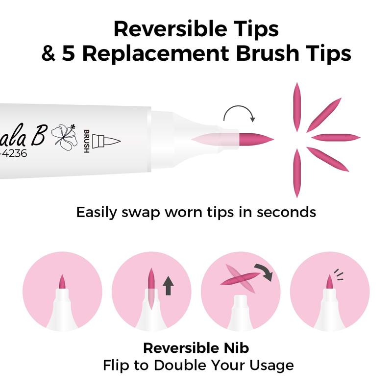 ·UNIQUE MINI BRUSH & SLIM BROAD TIPS: Kaala B series features a unique dual tip design of mini brush & slim broad tips. The mini brush tip(1-4mm) is smaller and sharper than brush tips of Honolulu series, allowing for greater flexibility in drawing details, calligraphy strokes and quick coverage of large areas. While the slim broad tip(1-6mm) is longer and sharper than chisel tip of Honolulu and Oahu series, offering better control for precise line widths. Ideal for sweeping, quick coloring in large areas.