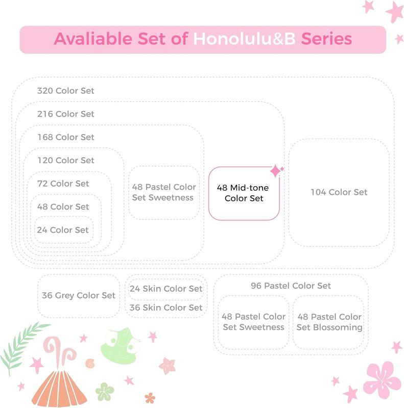 363 available colors of Ohuhu Honolulu & Honolulu B series, distributed in 15 sets. This is 48 mid-tone colors set. Strat to collect your own Ohuhu color family!