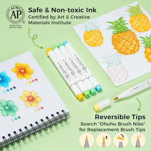 ·BRUSH & FINE, DOUBLE-TIP, DOUBLE THE FUN: Widen your artistic horizons with the dual-tip marker design! Choose the brush tip for sweeping, calligraphic strokes or the fine tip for details. What's more, now Ohuhu replacement brush tips is available, so you can easily replace the worn-out tips to ensure consistent and precise lines whenever you create. The only limit is your imagination.