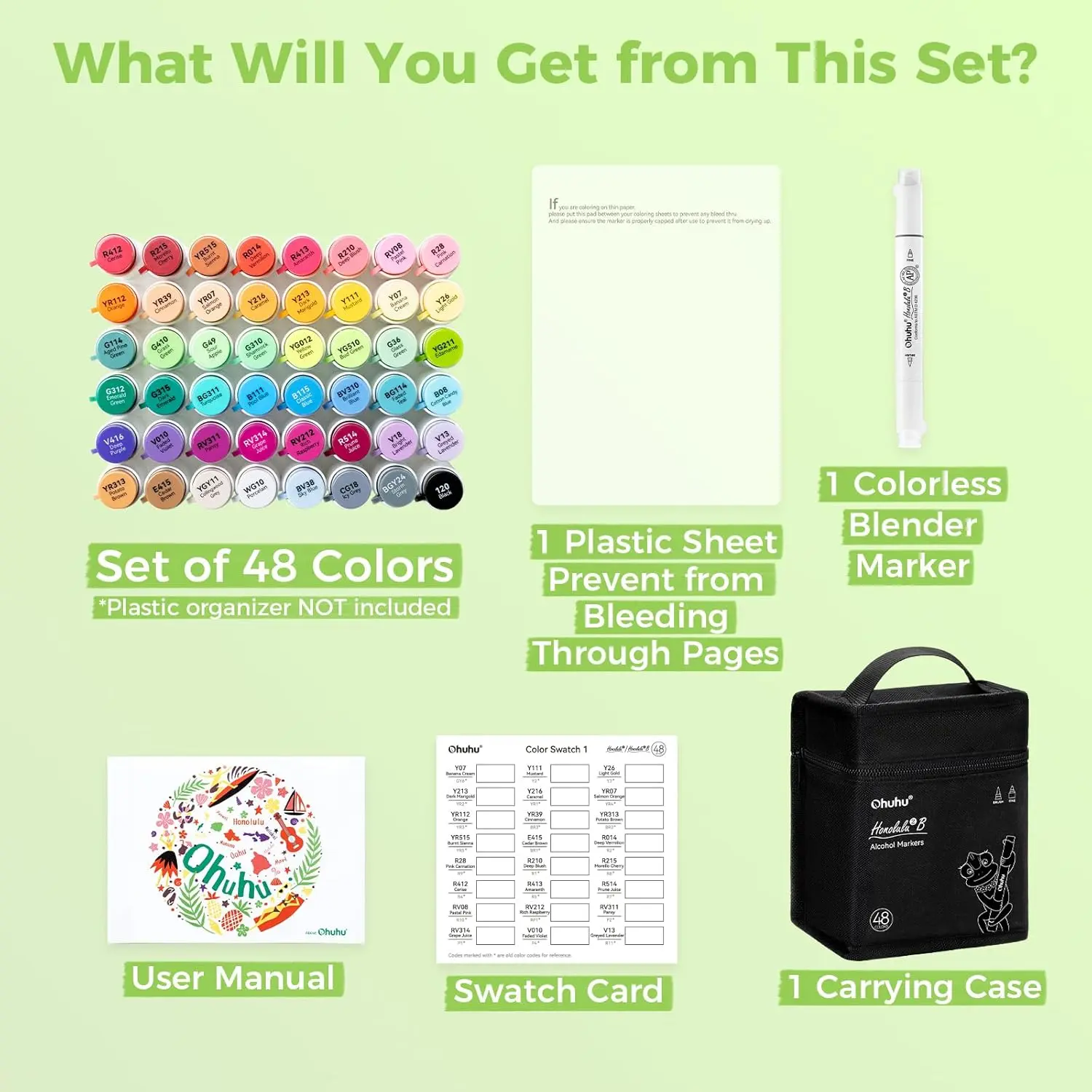 Package includes: 48 alcohol markers in vibrant colors, 1 plastic sheet to prevent from bleeding through, 2 swatch cards for color testing, 1 user manual, 1 colorless blender and 1 carrying case for storage.