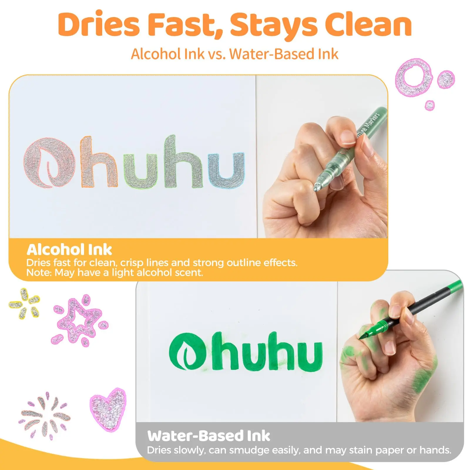 ·QUICK-DRYING ALCOHOL-BASED INK: Ohuhu’s alcohol-based ink delivers a significantly sharper double-line effect on paper compared to water-based markers. The ink dries rapidly, preventing smudges and keeping your hands clean. Please note: There may be an initial alcohol scent upon opening; this dissipates quickly with use.