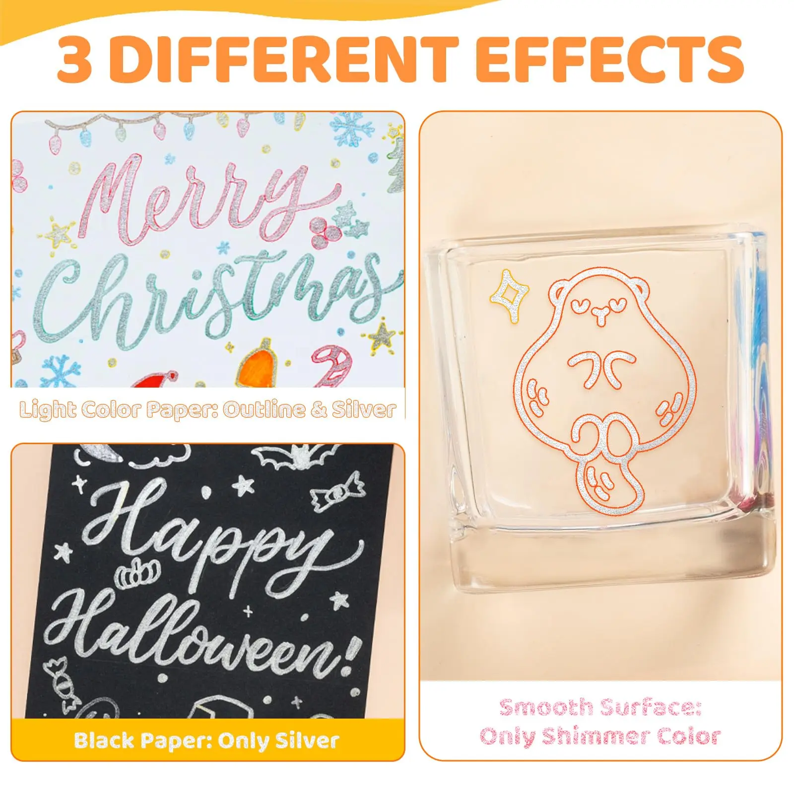·3 MAGICAL EFFECTS ON MUTIPLE SURFACES: Unleash limitless creativity. These outline markers deliver a vibrant double lines on light-color papers( watercolor, mix-media, pastel-color cards) and brilliant silver glitter only on dark-color cards or black papers. Leaving all-over glittery color on smooth surfaces( glass, plastic, rock and more...)