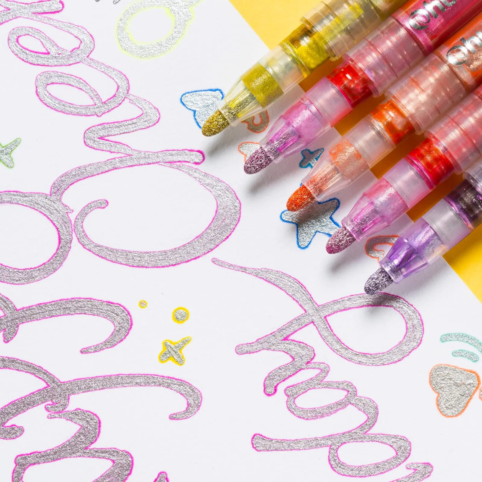 ·18 VIBRANT DOUBLE LINE MARKERS: Experience 18 stunning double-line effects with these innovative outline markers. Each features a brilliantly shimmering silver core that pops dramatically against the page, surrounded by a vibrant, ultra-saturated colored outline. Discover 18 unique dazzling combinations – one for every vivid hue perfectly paired with its sparkling silver heart.