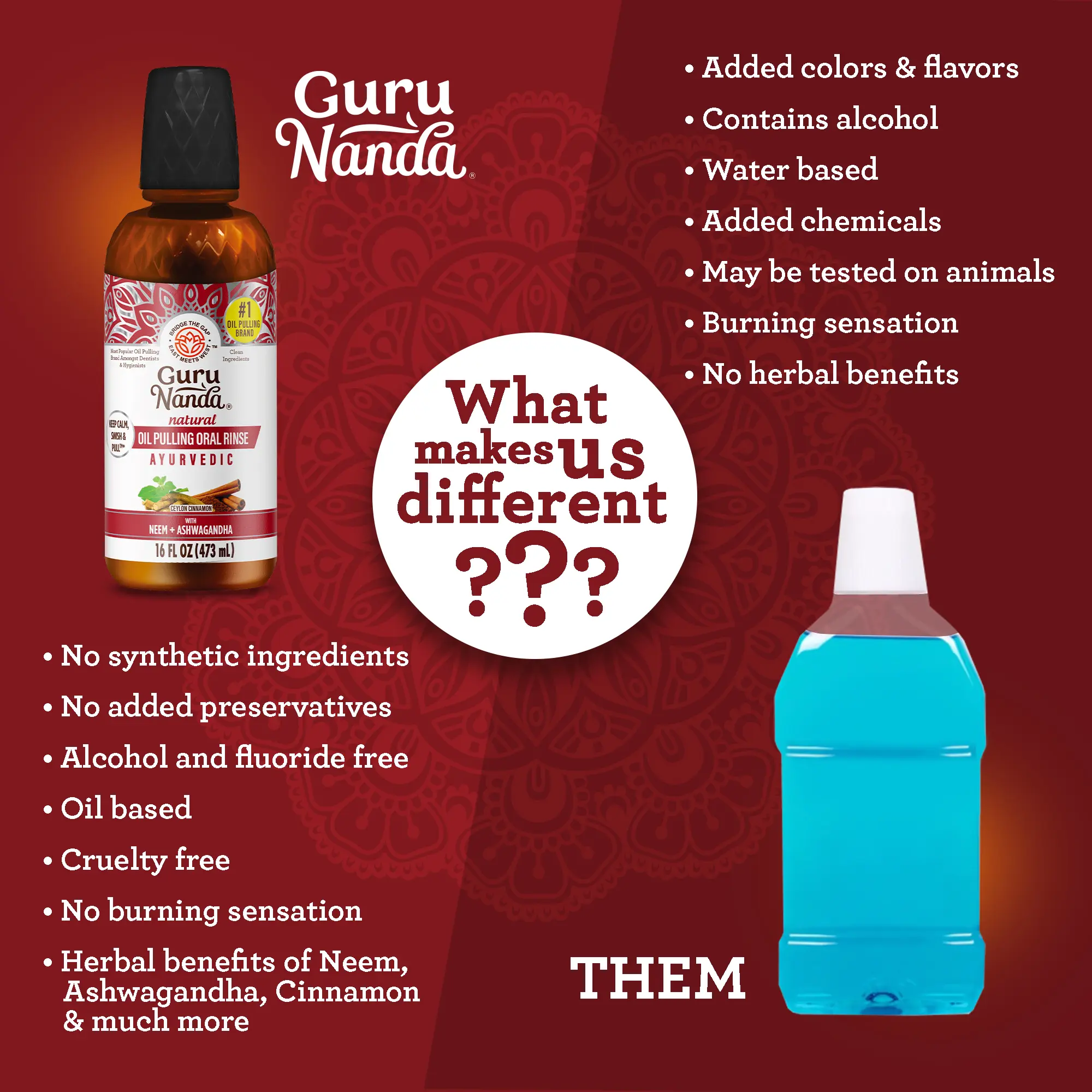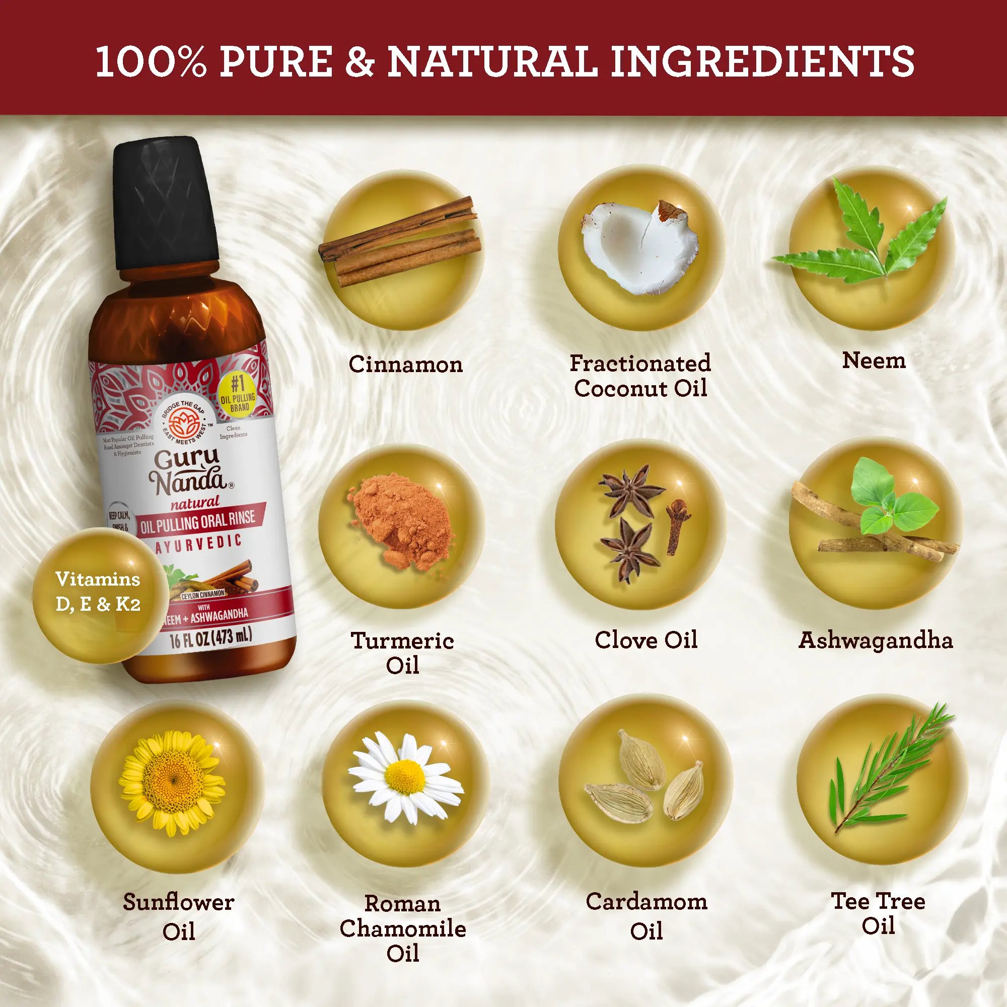 AYURVEDIC TRADITION MEETS INNOVATION: Experience Ayurvedic oil pulling with GuruNanda Ashwagandha Oil Pulling blend . This natural oil and herb fusion offers a modern, holistic approach to oral wellness, maintaining traditional quality.