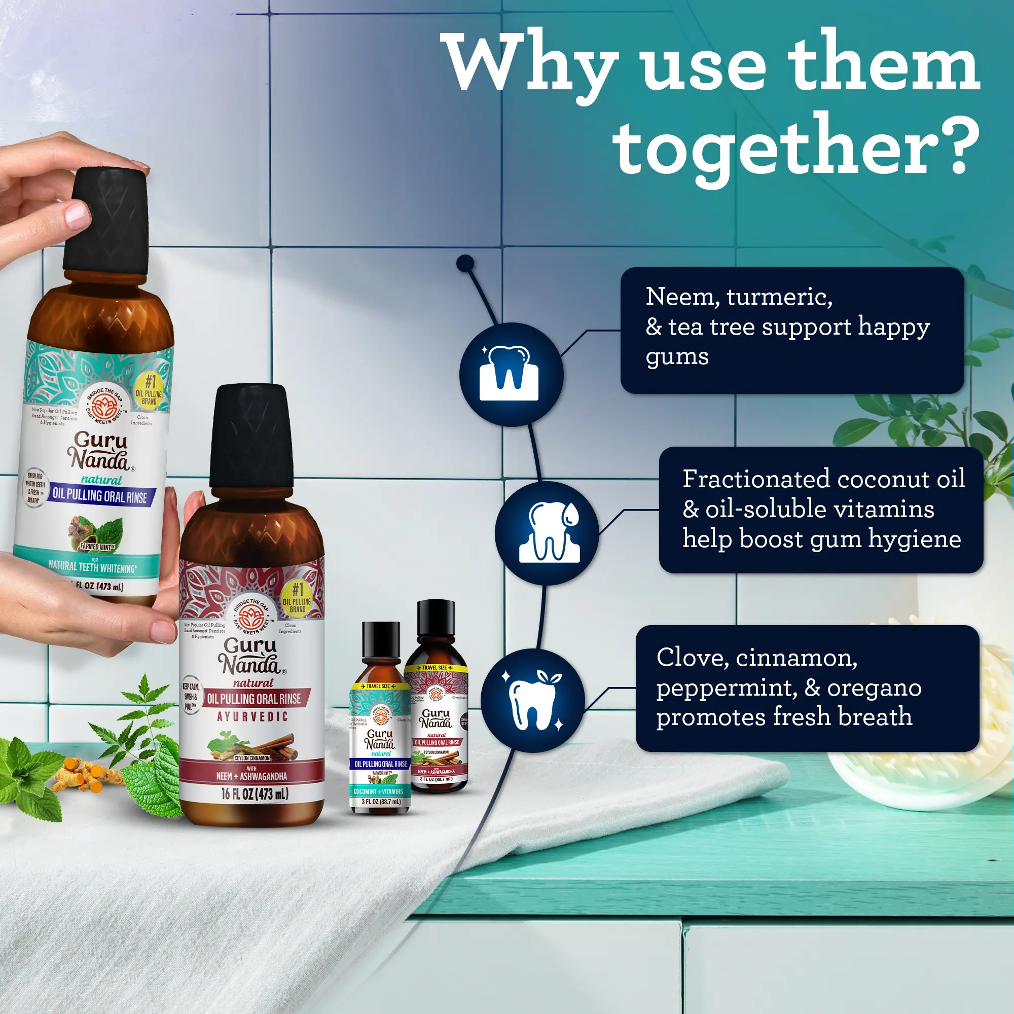 It contains MCT fractionated coconut oil, essential oils (Tea Tree, Peppermint, Clove, Oregano, Fennel, Spearmint, & Cardamom), & Vitamins D3, E, and K2. Hydrophobic & lipid-inspired, it enhances your oral care routine. GuruNanda Pulling Oil supports natural teeth whitening with continued use, provides up to 12 hours of fresh breath, & promotes gum hygiene.
