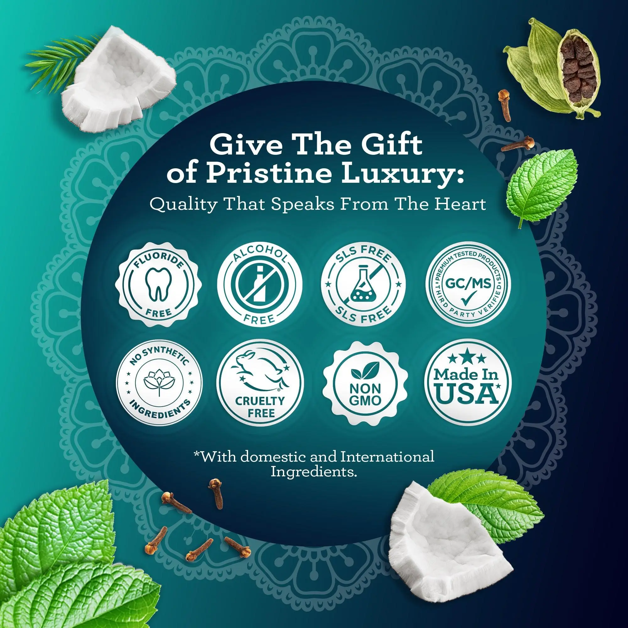 Fractionated MCT coconut oil with ashwagandha, neem, turmeric, and pure essential oils for daily oral care routine.