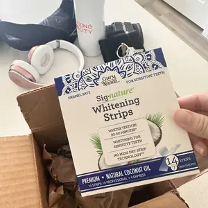 Our dry-strip whitening strips formula combines hydrogen peroxide with soothing coconut extracts, helping to break down stains & whiten teeth.