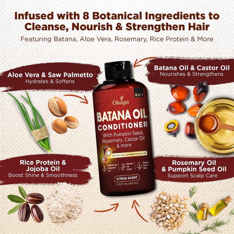 Give your hair the hydration it deserves. The OKAGA Batana Oil Conditioner is a rich, creamy formula powered by 8 natural ingredients to help restore softness, manageability, and shine—without weighing hair down. Whether you're dealing with dryness, frizz, or dullness, this conditioner is your daily partner for healthier-looking strands.