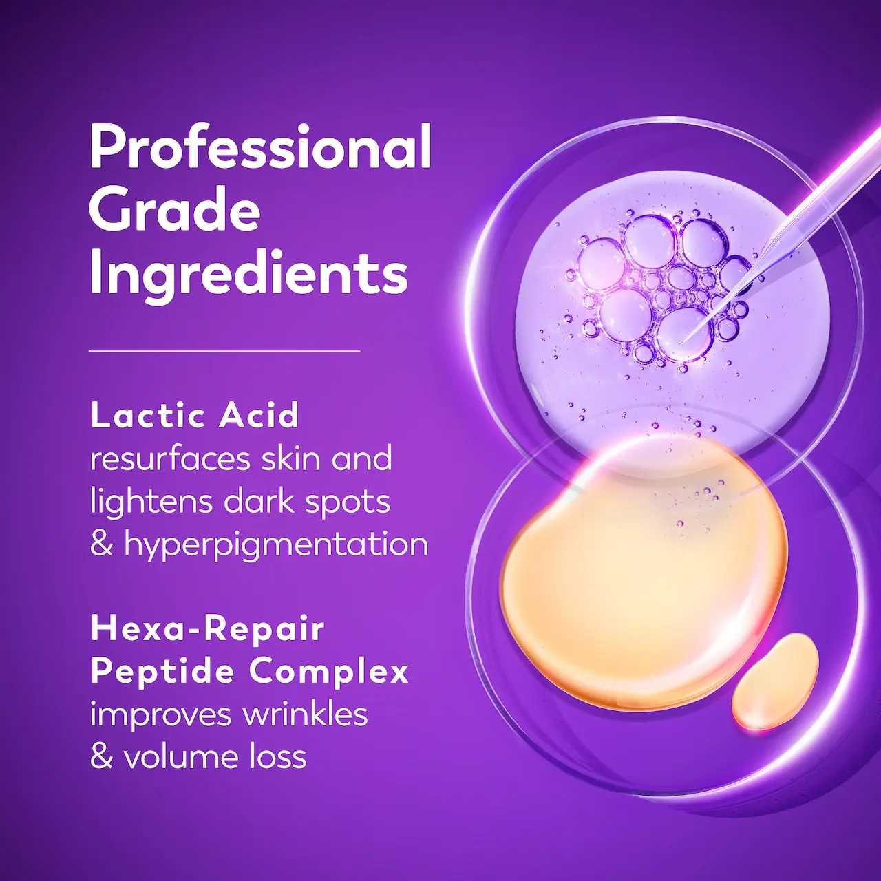 Let our AHA-powered formula exfoliate and resurface your skin, diminishing the appearance of texture irregularities, discoloration, and dark spots. Paired with our advanced peptide technology, this treatment provides a non-invasive solution to achieve firmer, youthful skin.
