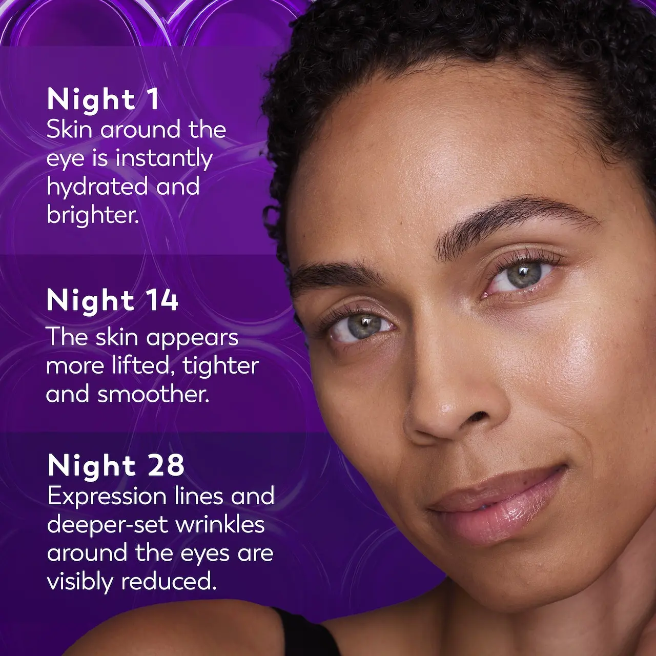 Night 1: Begins hydrating to plump and regenerate shape across the skin's surface, delivering immediate improvements in texture.