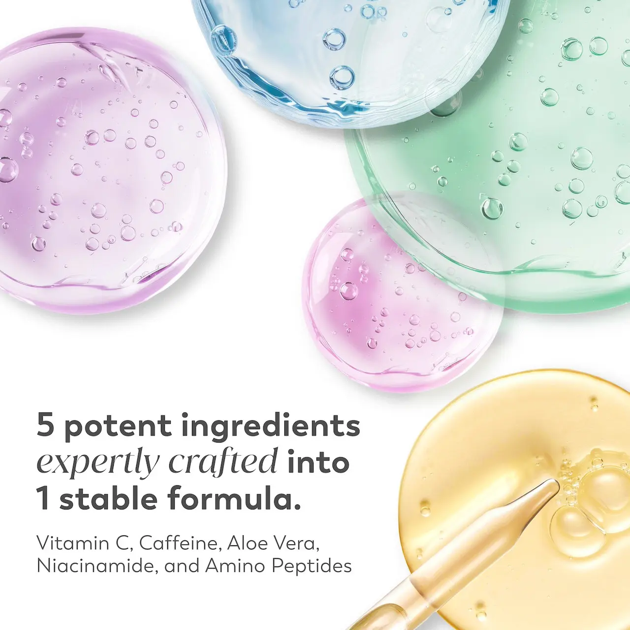 | Ingredients | WATER, GLYCERIN, NIACINAMIDE, ZEA MAYS (CORN) STARCH, COCO-CAPRYLATE/CAPRATE, CAPRYLIC/CAPRIC TRIGLYCERIDE, DIMETHICONE, PANTHENOL*, PALMITOYL PENTAPEPTIDE-4**, CAFFEINE, 3-O-ETHYL ASCORBIC ACID***, ALOE BARBADENSIS LEAF JUICE POWDER, ETHYLHEXYLGLYCERIN, HYDROXYACETOPHENONE, POLYGLYCERIN-6, DIMETHICONOL, STEARYL ALCOHOL, CETYL ALCOHOL, BEHENYL ALCOHOL, DISODIUM EDTA, SODIUM ACRYLATE/SODIUM ACRYLOYLDIMETHYL TAURATE COPOLYMER, CETEARYL OLIVATE, SORBITAN OLIVATE, POLYGLYCERYL-6 LAURATE, C15-19 ALKANE, SILICA, PHENOXYETHANOL, TITANIUM DIOXIDE, MICA *Pro-Vitamin B5, **Peptide, ***Vitamin C |