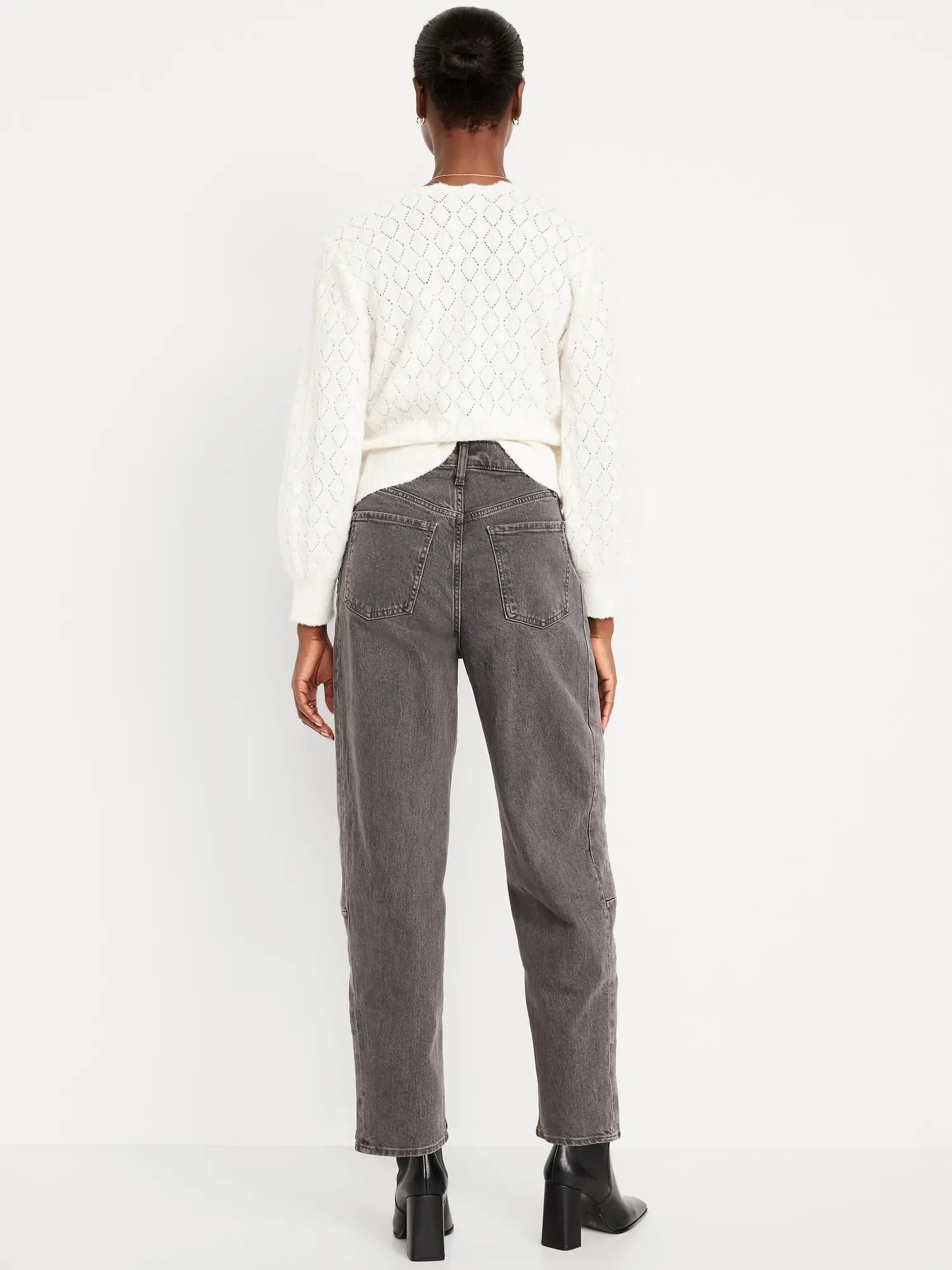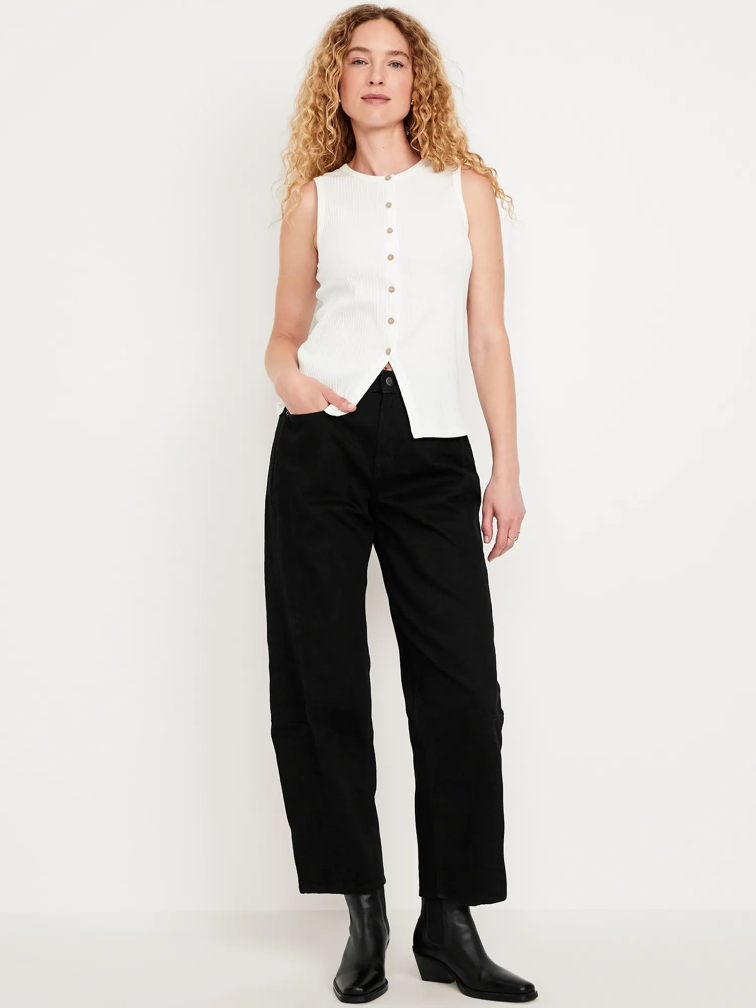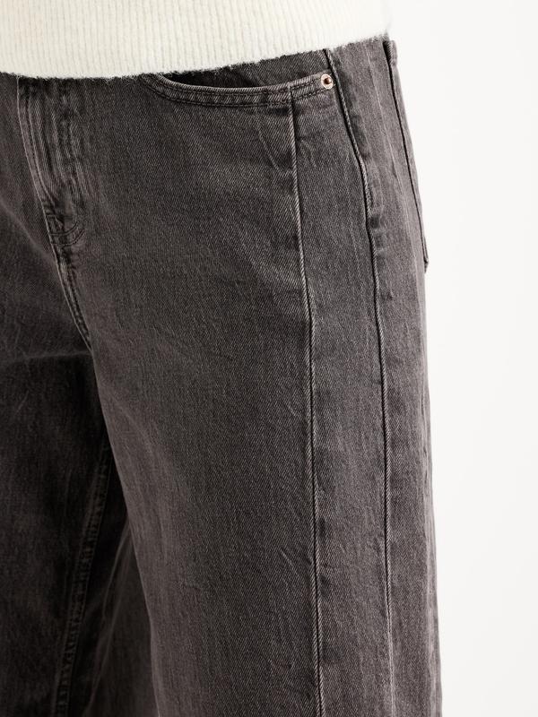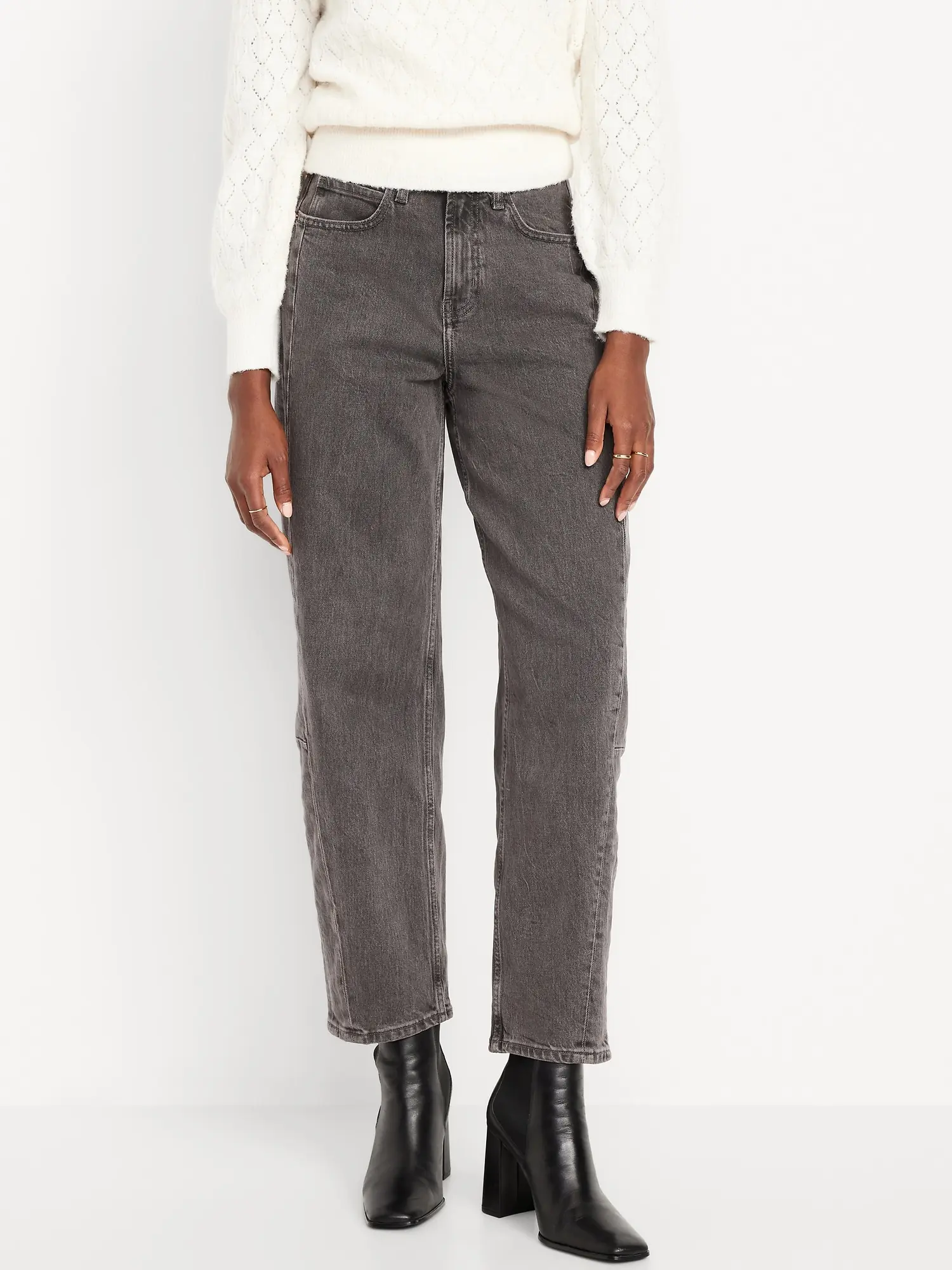 sits at belly button baggy barrel shape through hip and thigh hits at ankle 26" regular inseam 24" petite inseam 29" tall inseam models are approx. 5'9" and wear sizes s (4), l (12), and xl (18)