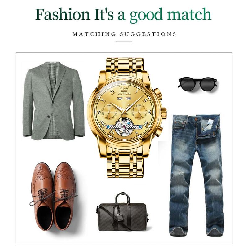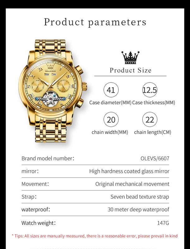 ·Automatic Mechanical Watches : genuine original movement, support automatic and manual winding, the tourbillon gear can offset the error caused by gravity to the parts in the escapement system of the watch, making the timing more accurate and the error smaller than ordinary automatic watches.