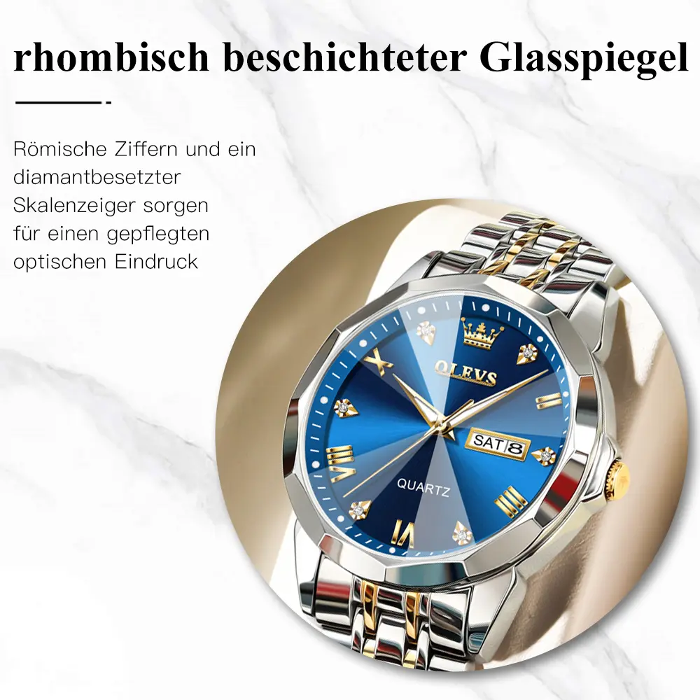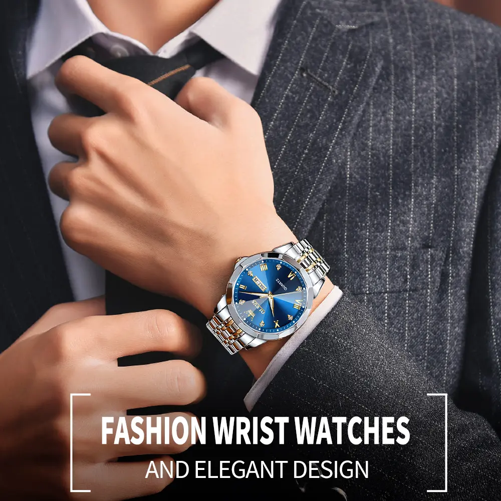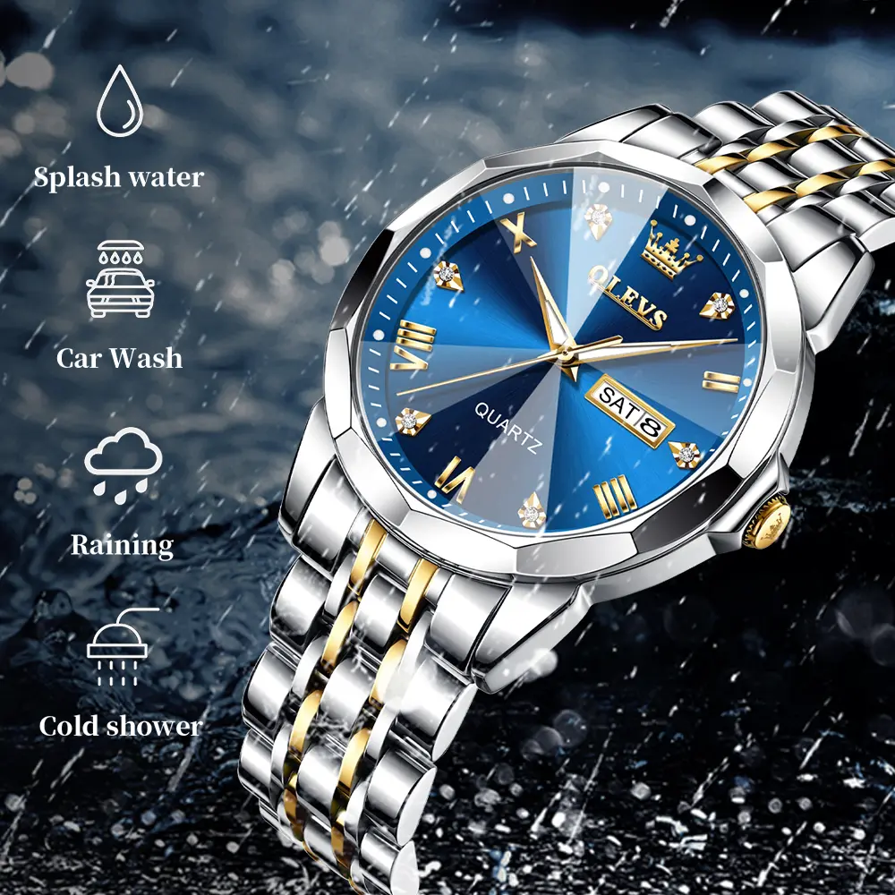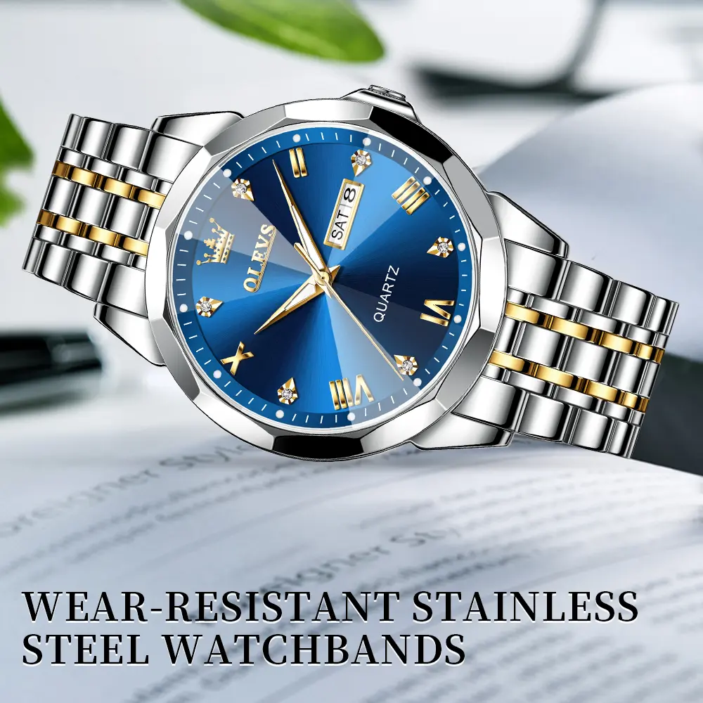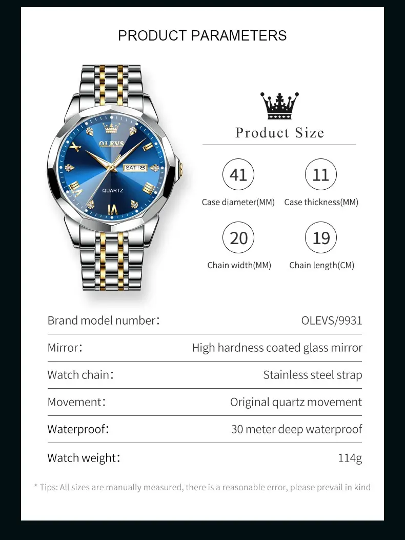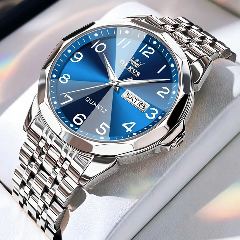 Elevate your style with the OLEVS G9931 watch. This analog quartz watch features a durable stainless steel case and band, ensuring comfort and reliability. The round dial with hardlex glass offers a sleek look, while the luminous dial ensures visibility in the dark. Perfect for business and casual wear, it's water-resistant up to 100 feet.