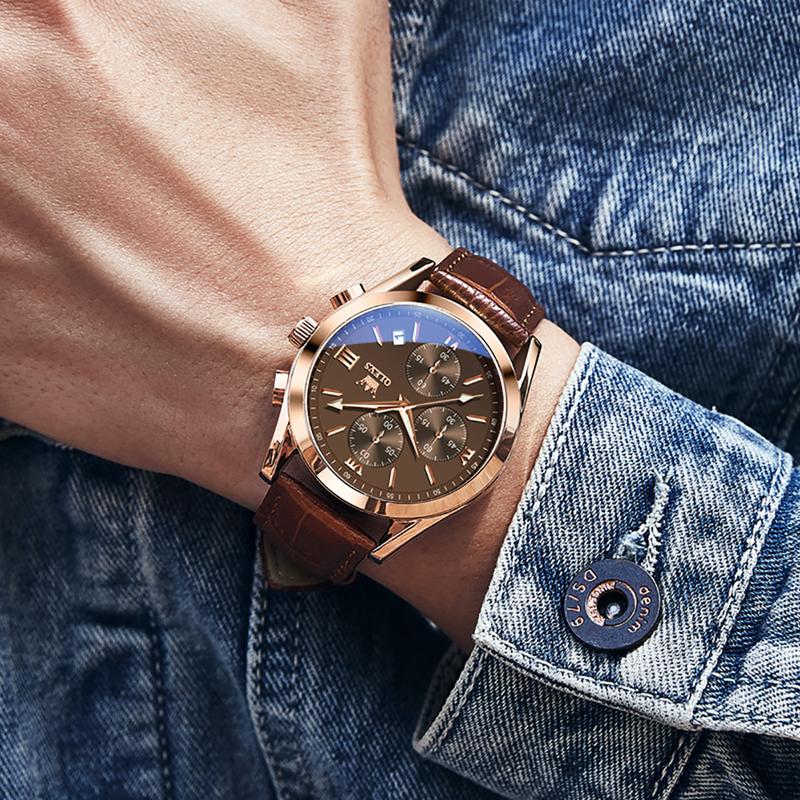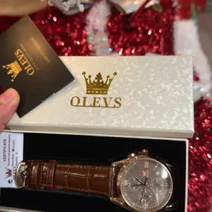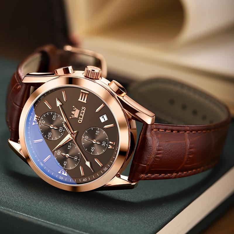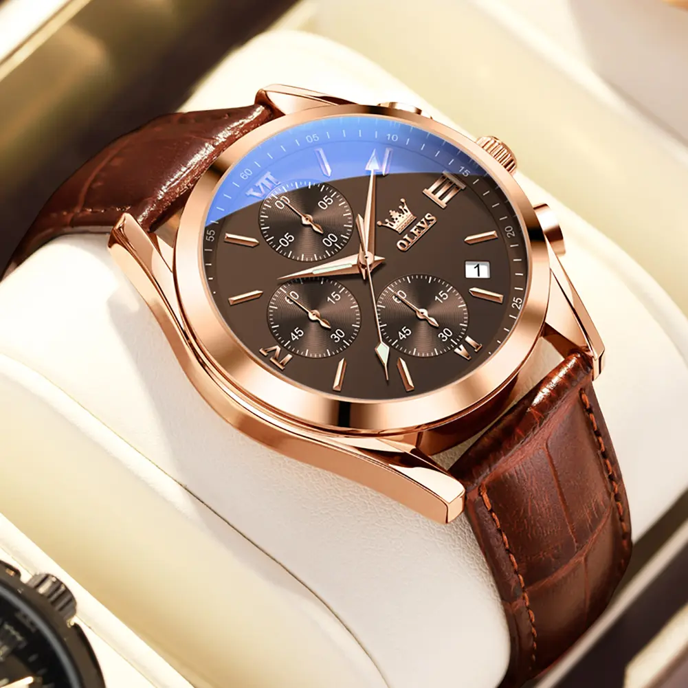 ·Imported OLEVS Chronograph Multifunction Design:High quality luxury black/brown leather strap, 4~5 o'clock is calendar window, 60- second chronograph, 1/ 10 second Su ubdial , 60- minute chronograph.