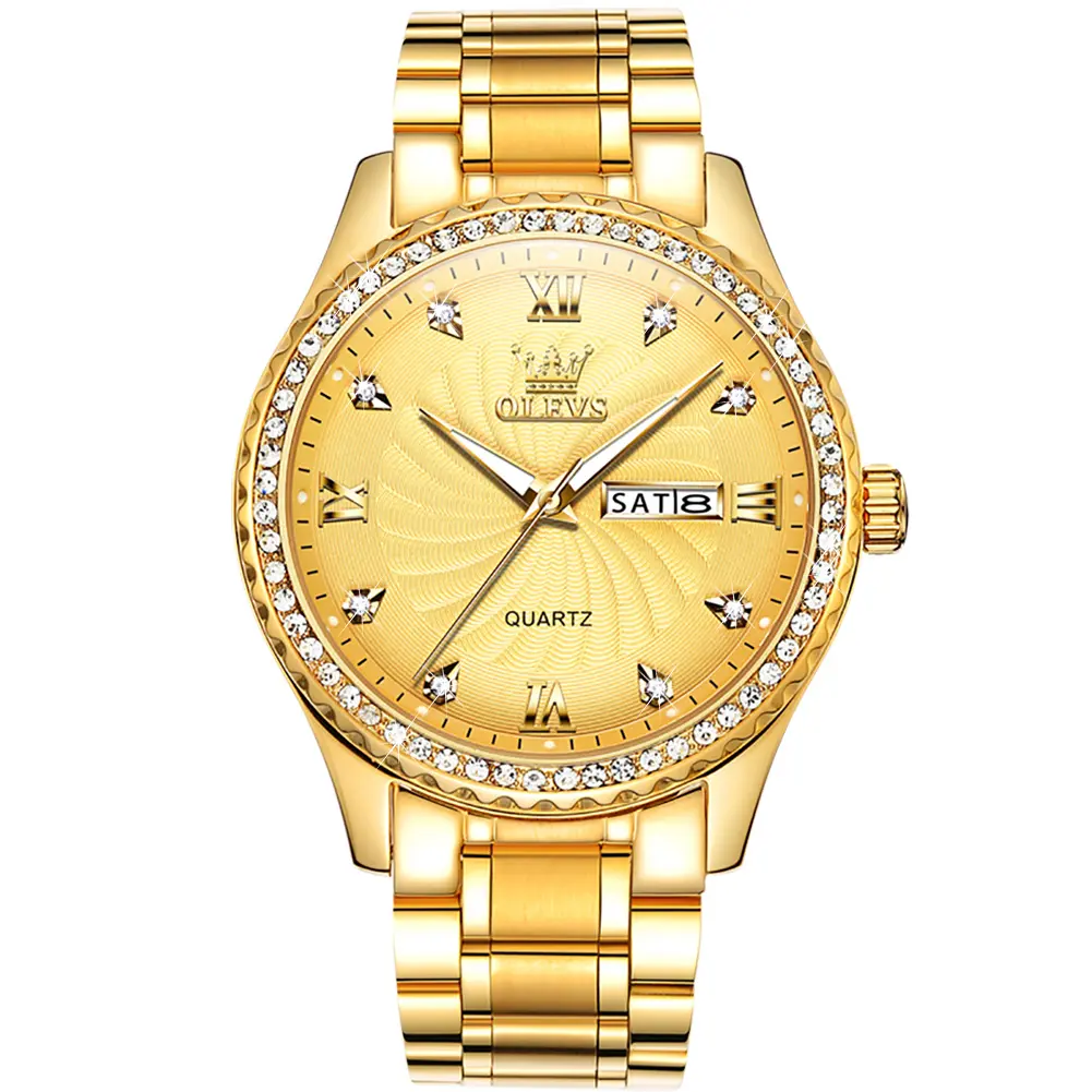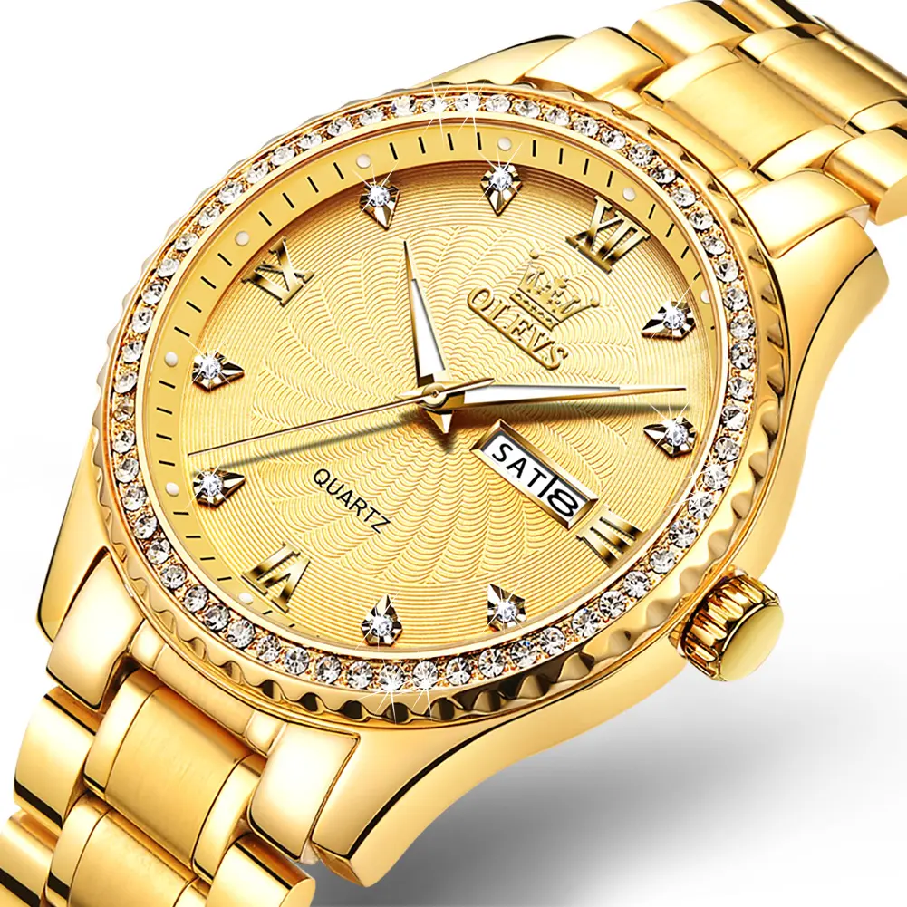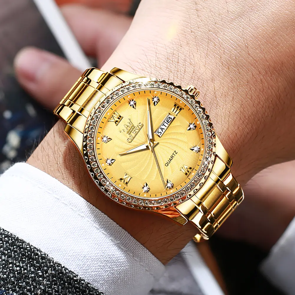 【Luxury Fashion Design】Golden diamond cut glass mirror is beautifully and handsomely designed. Arabic numerals and double calendar window display for easy reading of time. Case diameter: 41mm. Case thickness: 11mm. This classic fashion simple formal watch is perfect for any occasion.