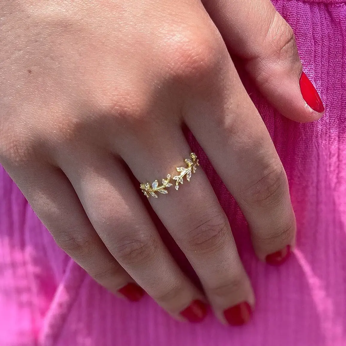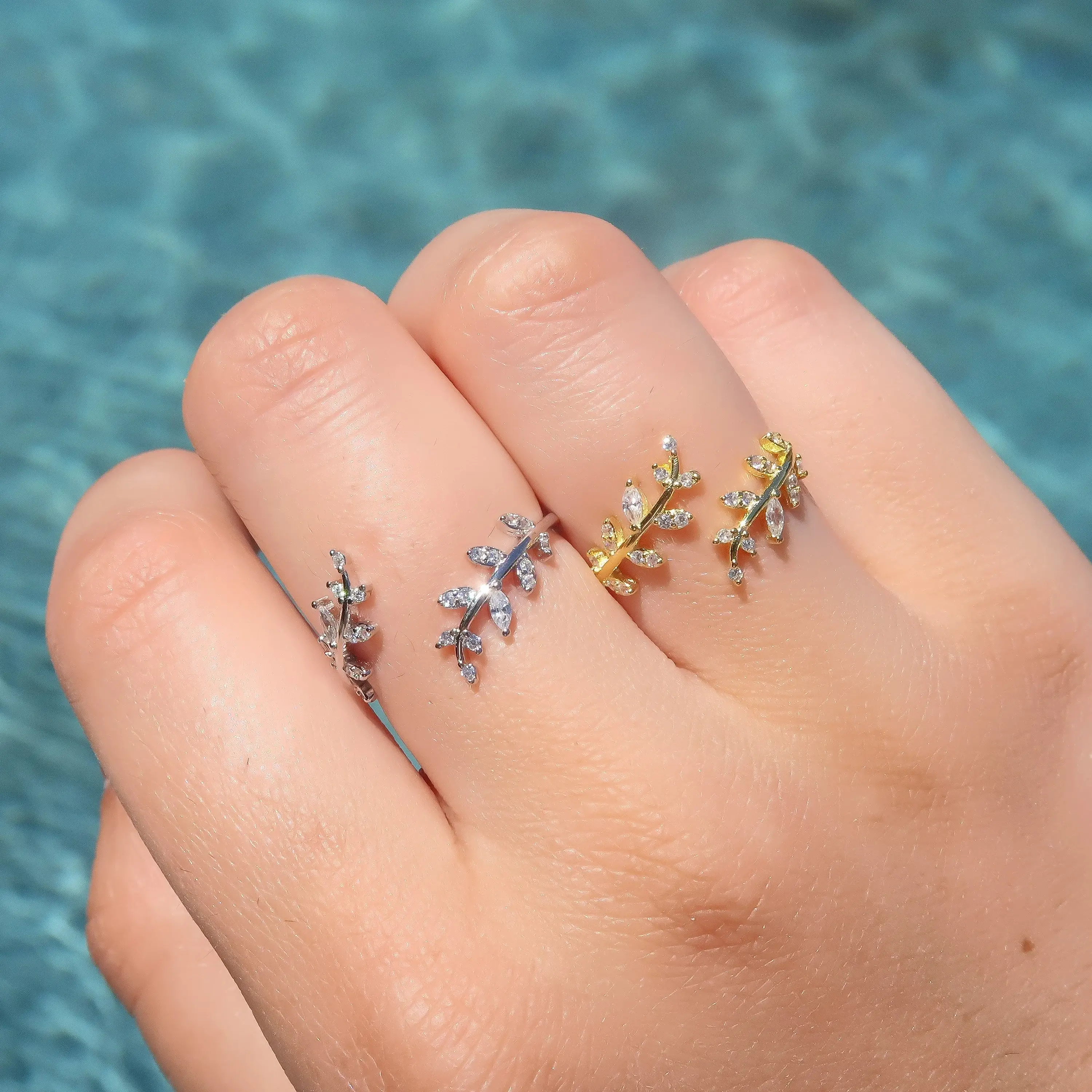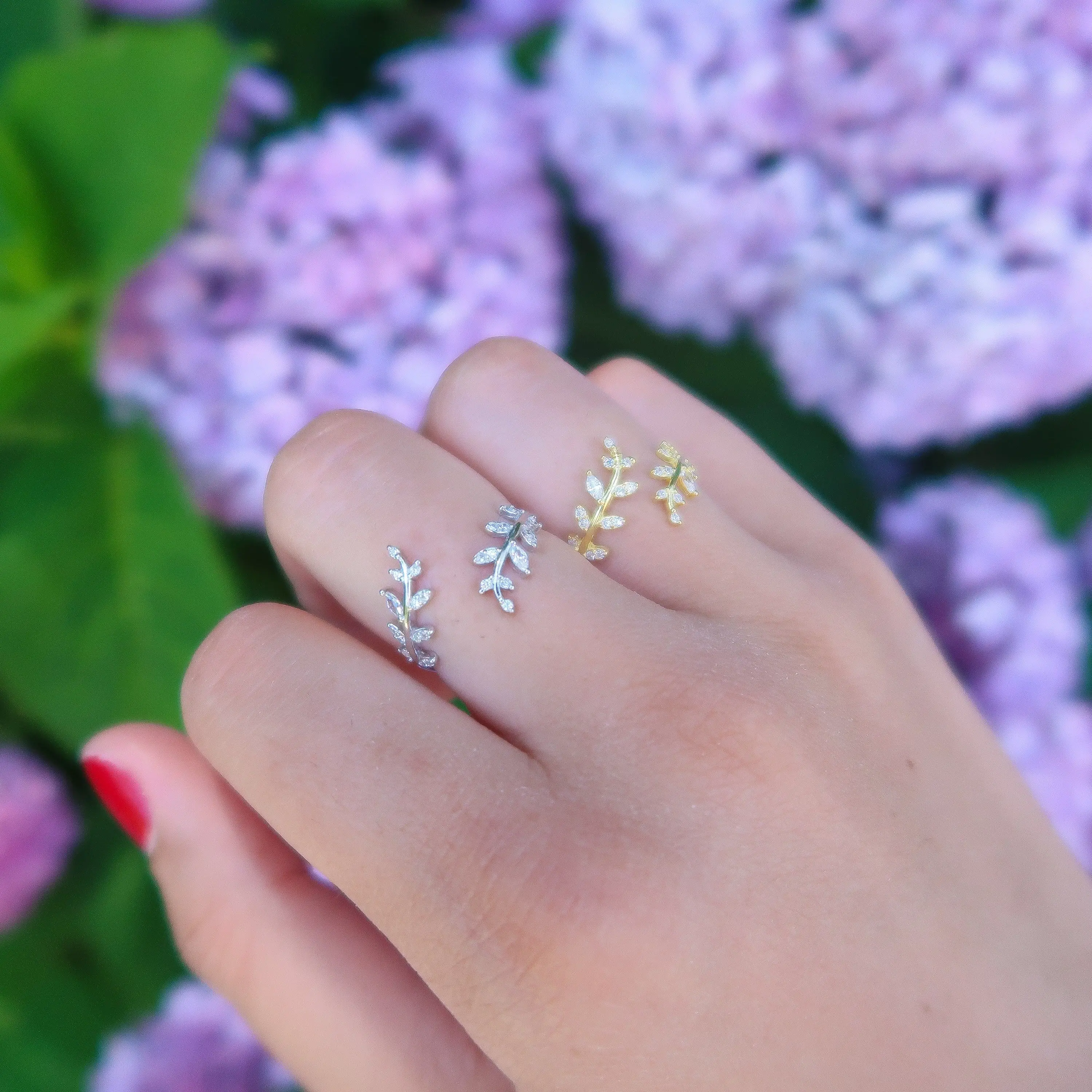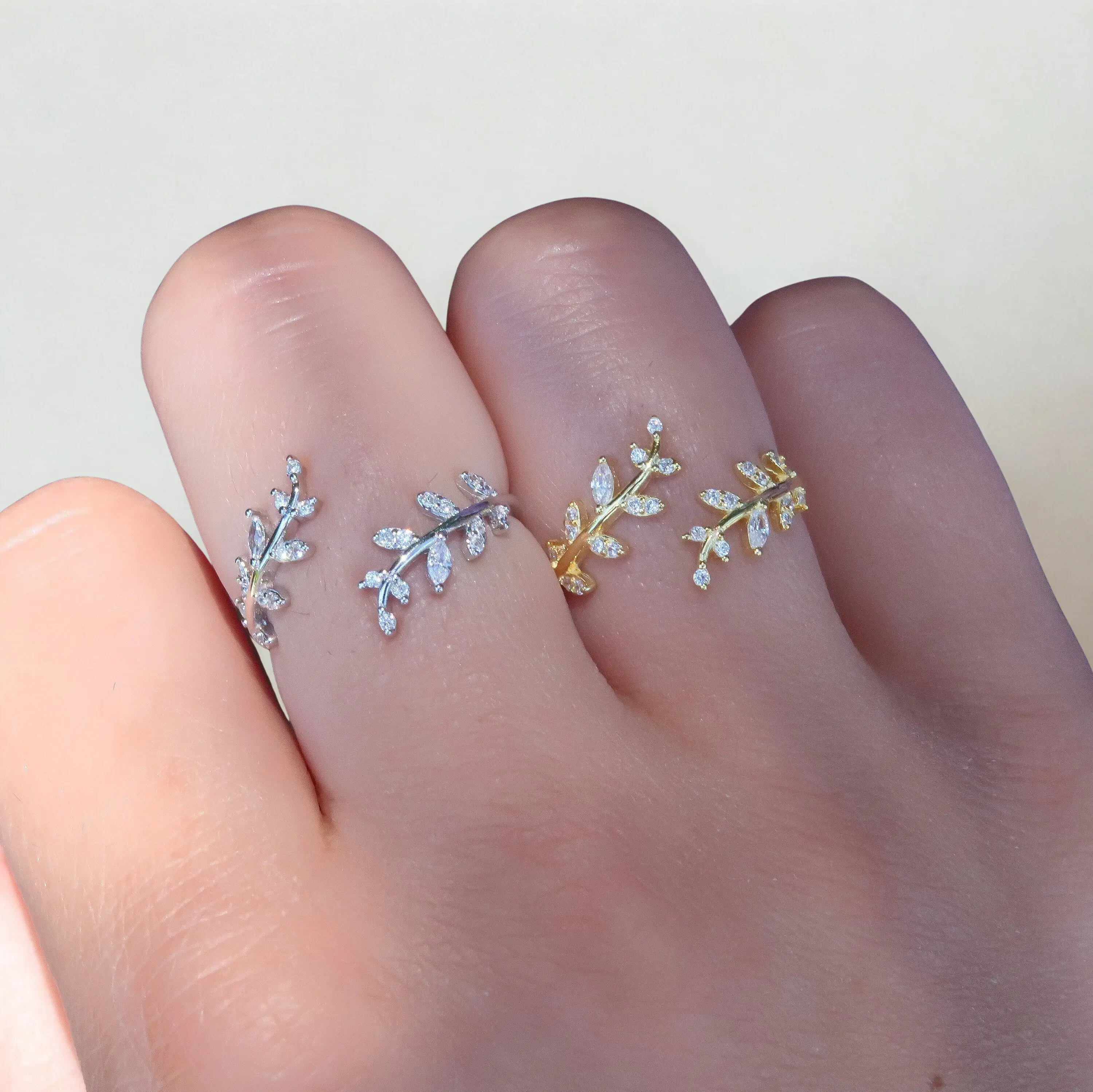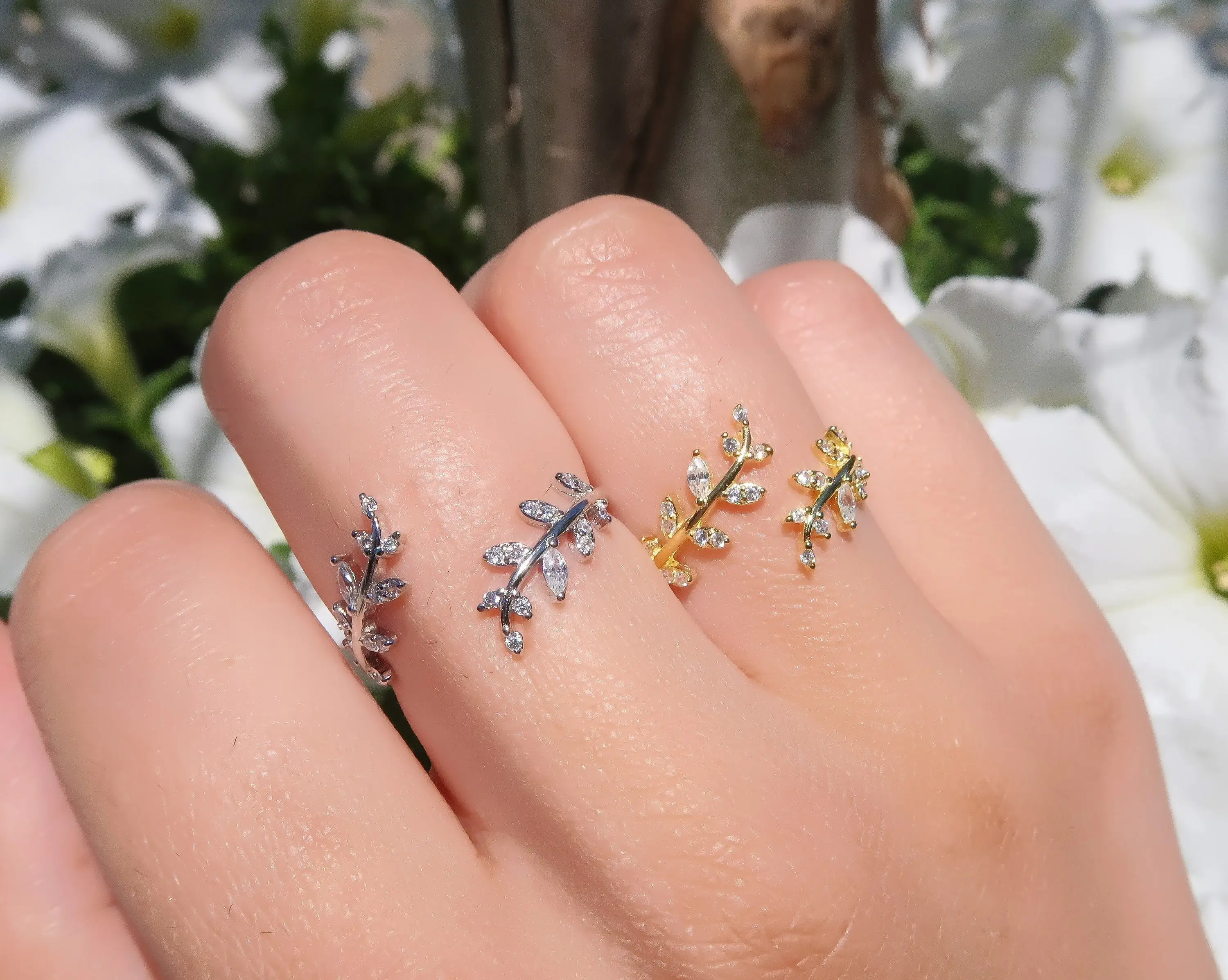 This delicate olive leaf ring wraps your finger in sparkling simplicity. Crafted from S925 sterling silver and finished in your choice of white gold or 18K gold plating, it features high-quality cubic zirconia stones that shimmer with every movement. The open wrap design is fully adjustable and perfect for stacking, gifting, or wearing solo — a minimalist statement inspired by nature.