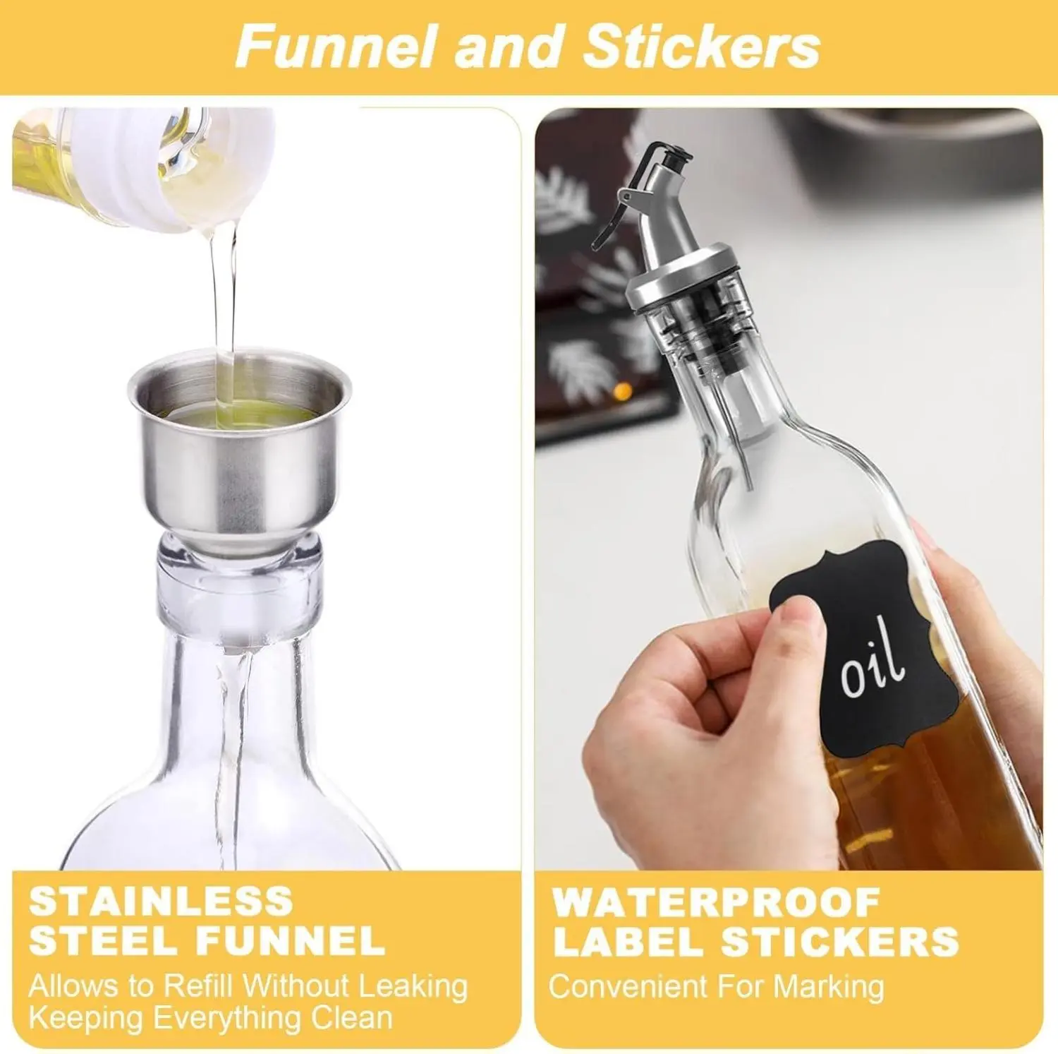 Includes 17oz Glass Oil Bottles2, Flip-Top Spouts2, Stainless Steel Funnel1, and Labels4. This set enhances your kitchen, making cooking easier. Place it beside the stove for convenience. It’s a wonderful tool to elevate your culinary experience.