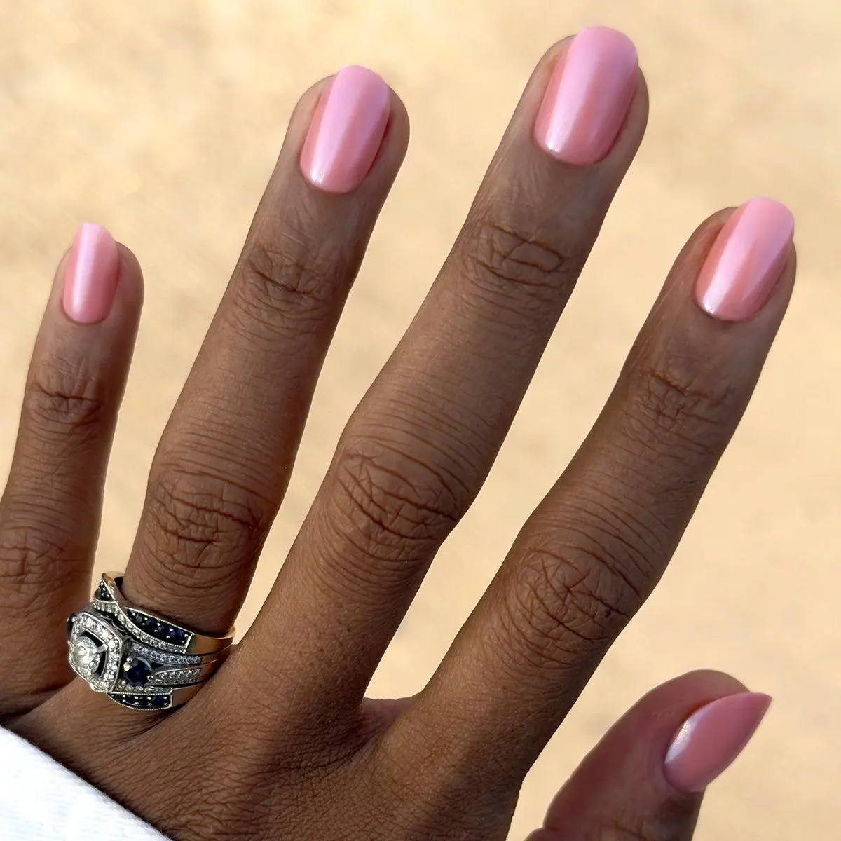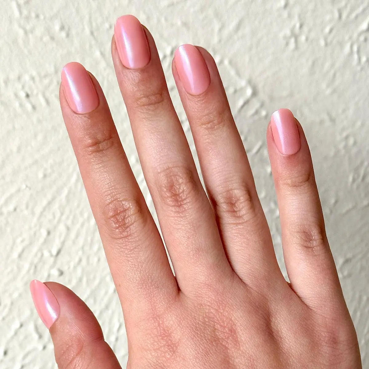 A sheer bubble gum pink-blue iridescent mani in a short round shape.“Olive Y’all! This is a sheer goldfish vibe with a bigger punch of pink.” XO SGT