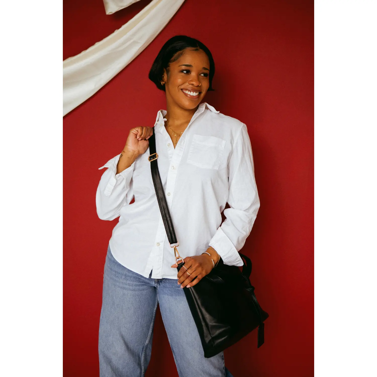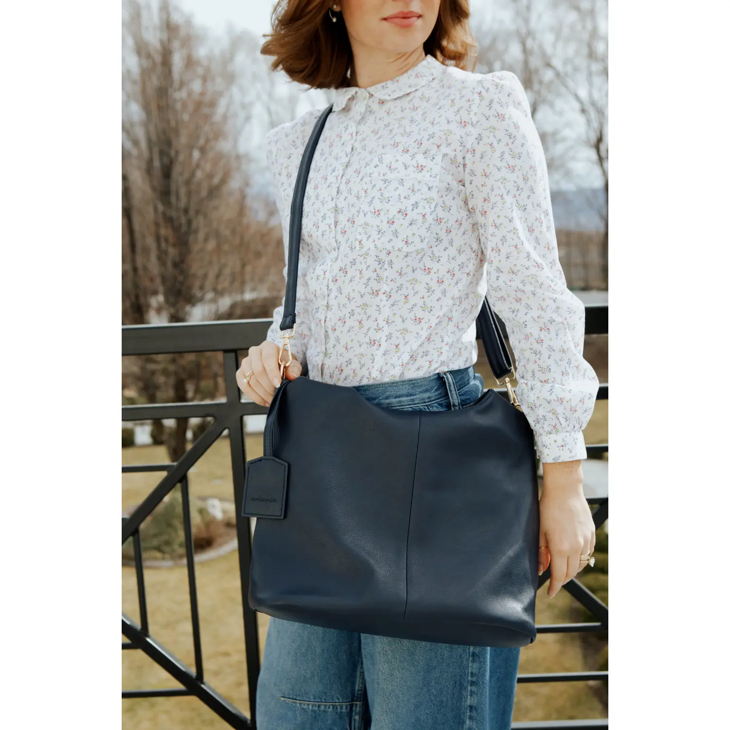 Received navy blue instead of black—lovely color. However, I didn’t like look and feel of the ‘leather’. When packed with my items, the bag felt heavy on the shoulder and cross-body, and became misshapen. I prefer the look, feel, carry, shape and structure of the Sawyer. Olivia was returned.