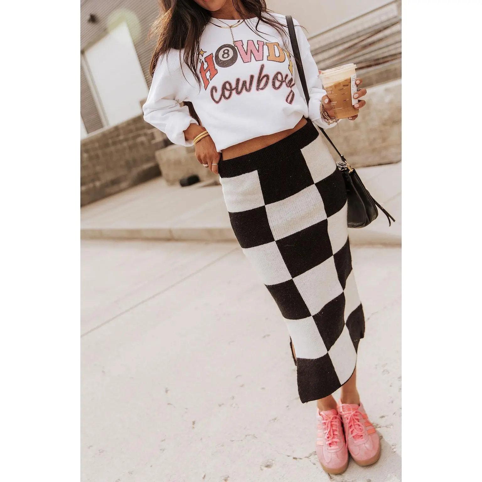 This skirt is giving cozy with a side of bold! 🖤 Featuring an elastic waist for an easy, pull-on fit, it’s made from a soft and stretchy sweater knit that hugs in all the right places. The black and white checkered pattern makes a statement, while the midi length and side slit keep things chic and comfy. Perfect for dressing up or keeping it casual—your new favorite go-to!
