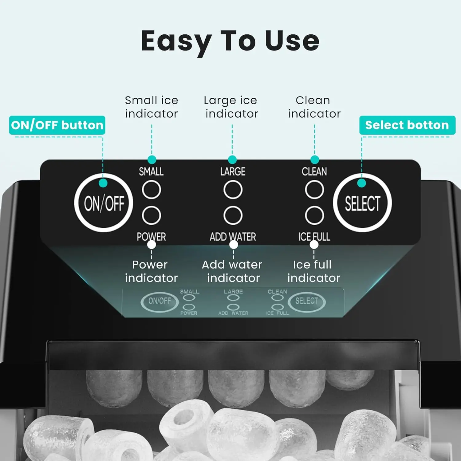 ·User-Friendly Operation: The clear ice cube maker control panel is designed for effortless use—just follow three simple steps to enjoy fresh ice cubes in no time. Intuitive indicators light up to signal when the water tank needs refilling or the ice bin is full. During operation, the portable ice maker operates at a noise level below 40 decibels.