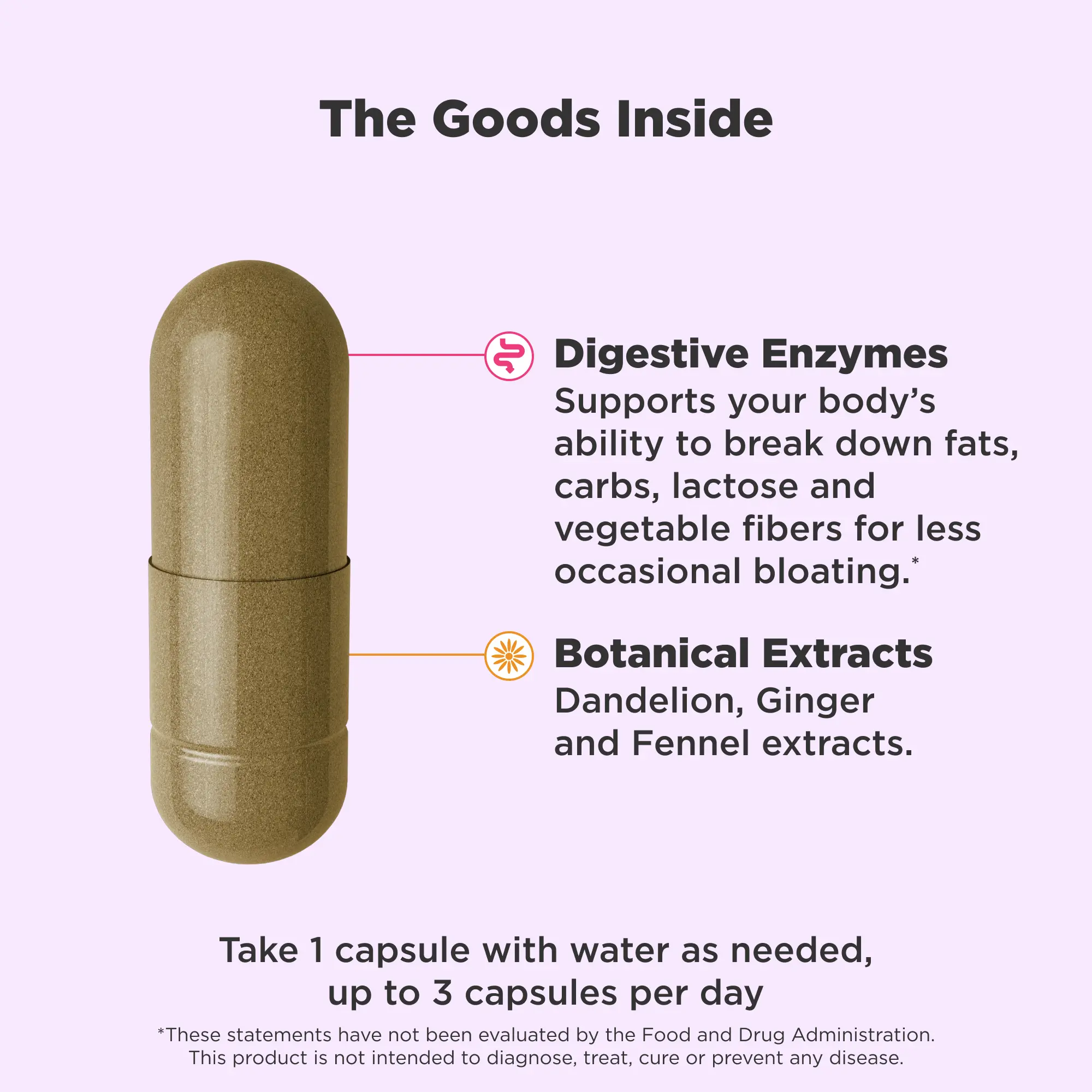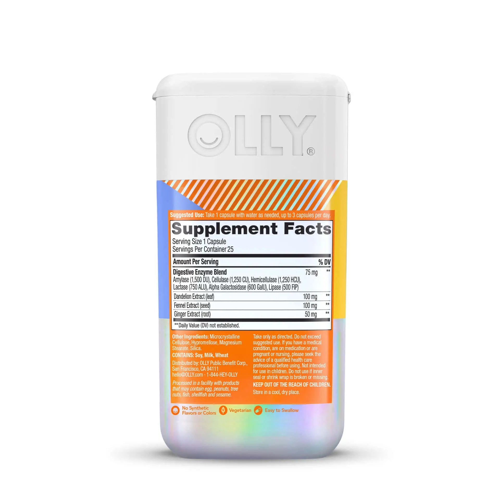 This supplement is designed to assist with digestive health. It's a blend of essential enzymes and extracts, offering a vegetarian option. Trust in its 25 capsules for your 25-day supply. Experience the difference with OLLY.