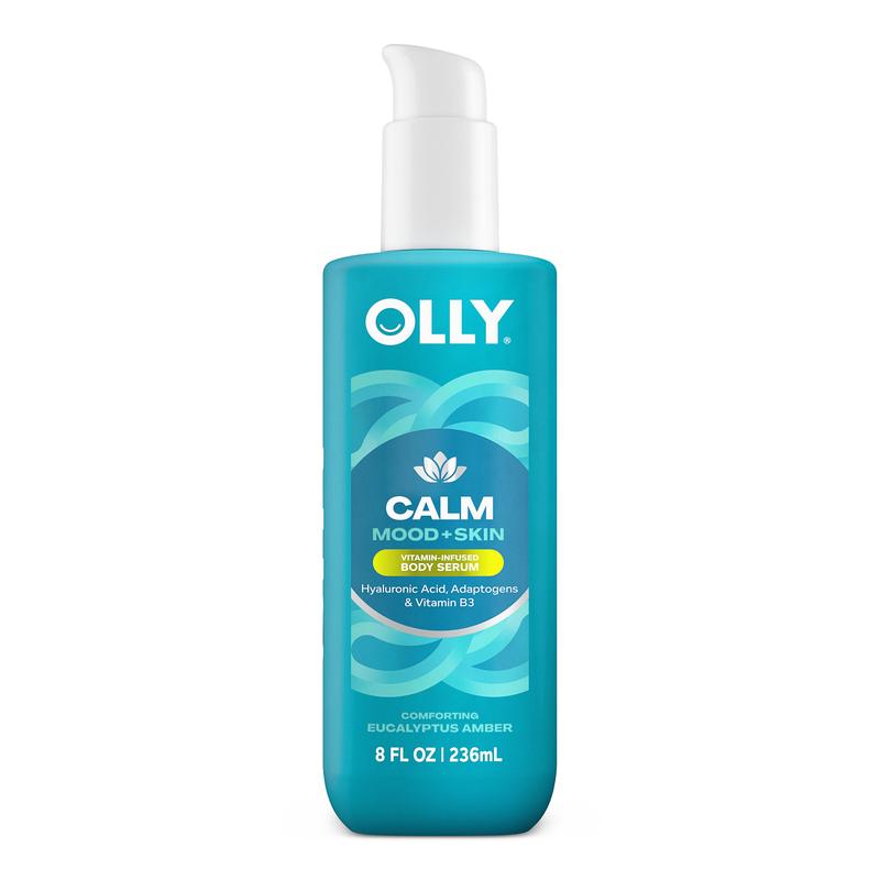 Meet OLLY CALM Mood + Skin Body Serum, a vitamin-infused, lightweight-yet-hydrating body moisturizer to soothe stressed skin and stressed out minds. Unlike a traditional body lotion, our body serum features concentrated actives that quickly absorb into the skin making it ideal for post-shower and bath nourishment. Clinically proven OLLY Vitamin Complex, infused with Hyaluronic Acid, Adaptogens, and Vitamin B3, helps calm and strengthen the skin barrier, while comforting notes of grounding eucalyptus and balancing amber are developed with neuroscientists to help you find your inner chill.