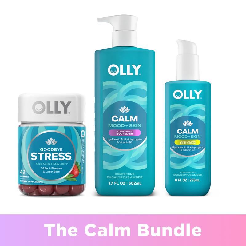 Meet OLLY CALM Mood + Skin Body Wash, a vitamin-infused, non-stripping gel cleanser that soothes stressed skin and stressed out minds. Clinically proven OLLY Vitamin Complex, infused with Hyaluronic Acid, Adaptogens, and Vitamin B3, helps calm and strengthen the skin barrier, while comforting notes of grounding eucalyptus and balancing amber are developed with neuroscientists to help you find your inner chill.