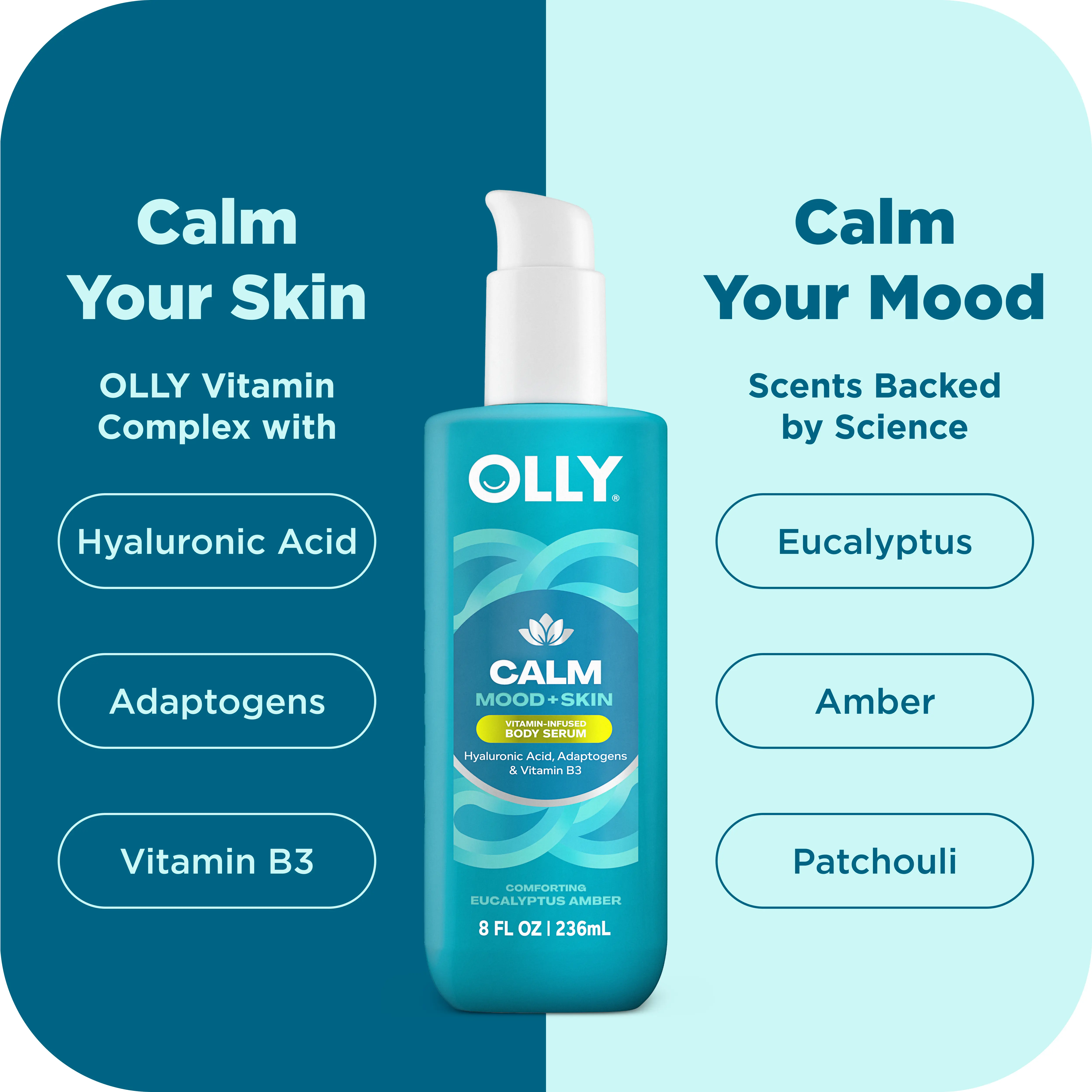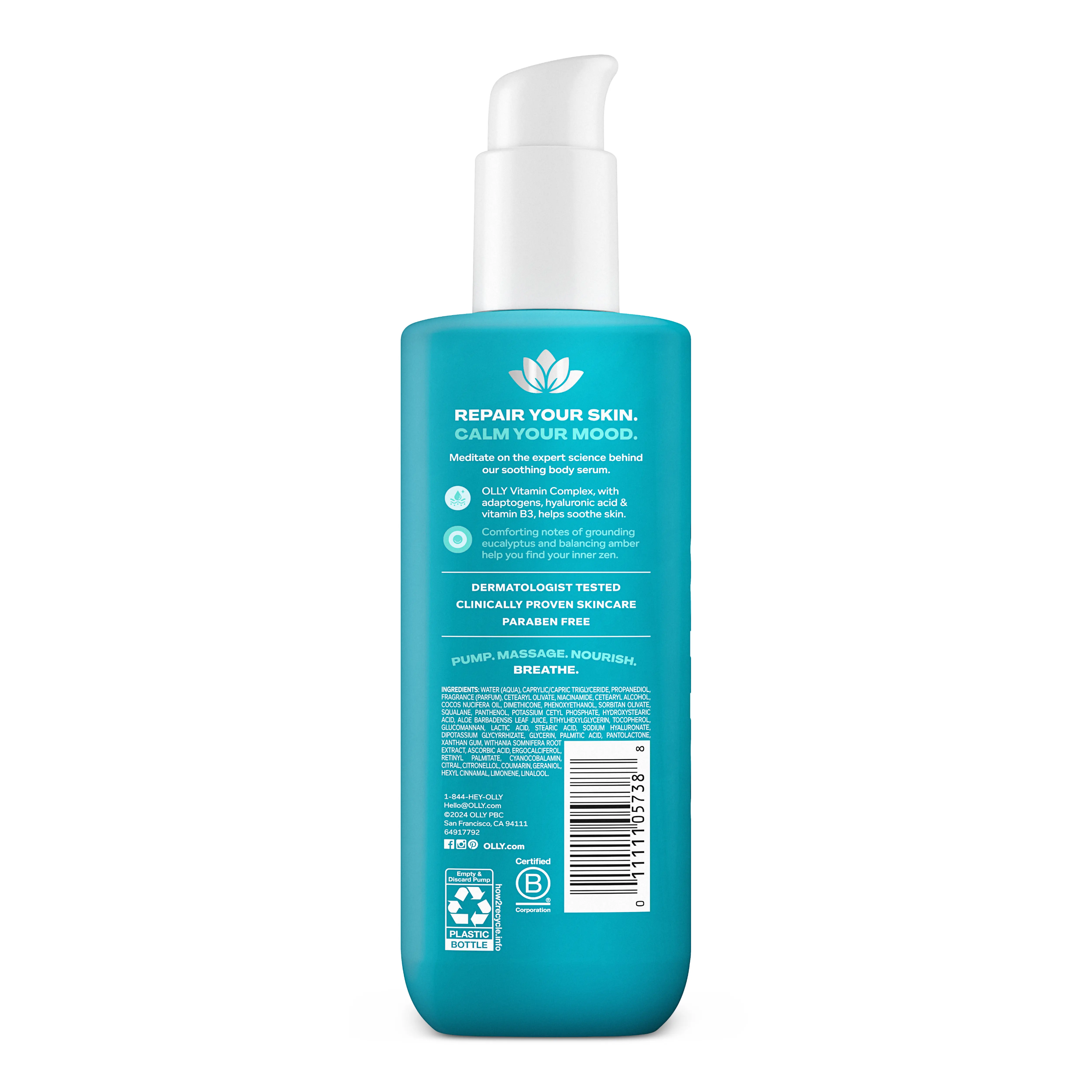 Meet OLLY CALM Mood + Skin Body Serum, a vitamin-infused, lightweight-yet-hydrating body moisturizer to soothe stressed skin and stressed out minds. Unlike a traditional body lotion, our body serum features concentrated actives that quickly absorb into the skin making it ideal for post-shower and bath nourishment. Clinically proven OLLY Vitamin Complex, infused with Hyaluronic Acid, Adaptogens, and Vitamin B3, helps calm and strengthen the skin barrier, while comforting notes of grounding eucalyptus and balancing amber are developed with neuroscientists to help you find your inner chill.