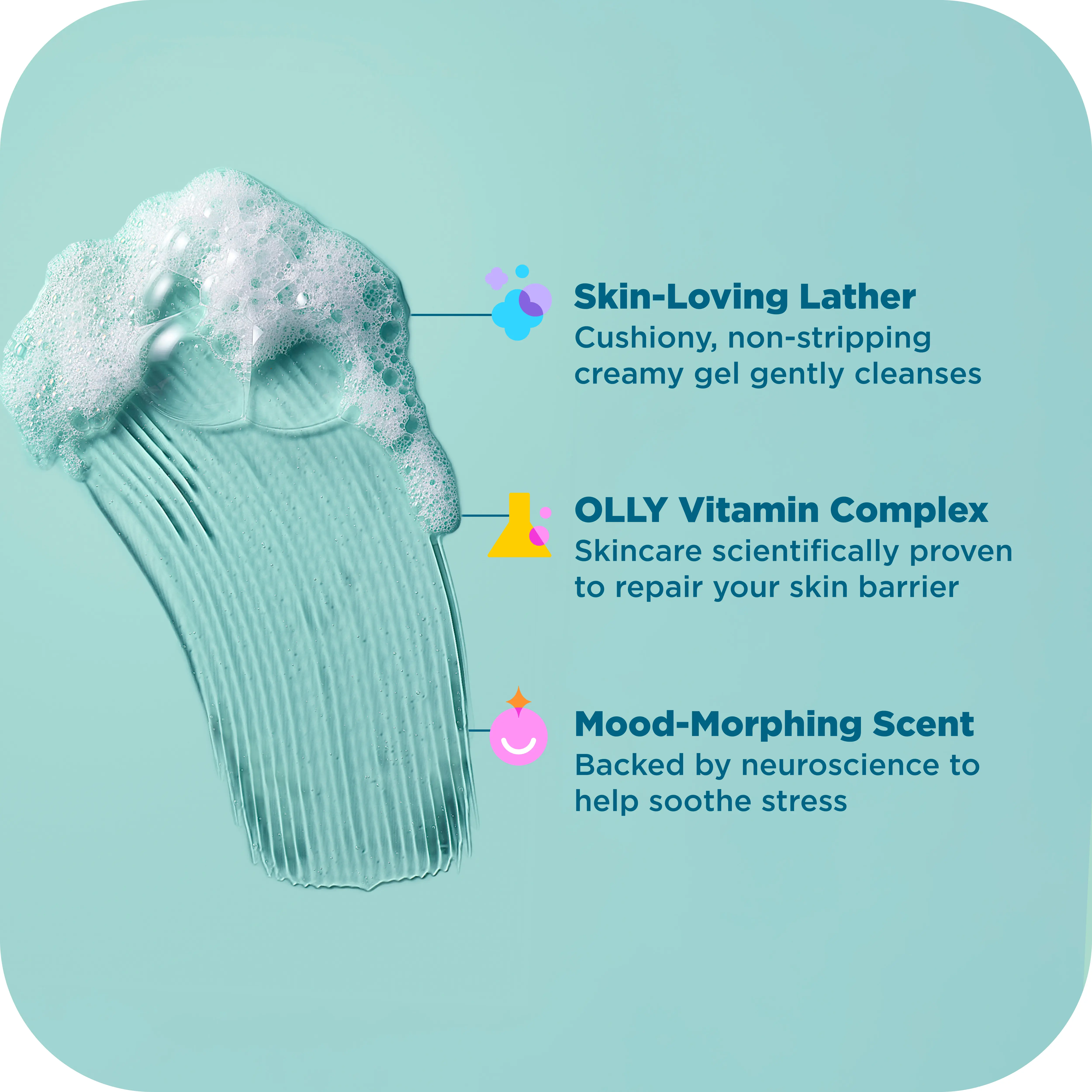 Meet OLLY CALM Mood + Skin Body Wash, a vitamin-infused, non-stripping gel cleanser that soothes stressed skin and stressed out minds.Clinically proven OLLY Vitamin Complex, infused with Hyaluronic Acid, Adaptogens, and Vitamin B3, helps calm and strengthen the skin barrier, while comforting notes of grounding eucalyptus and balancing amber are developed with neuroscientists to help you find your inner chill.
