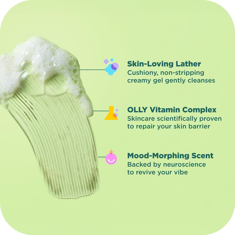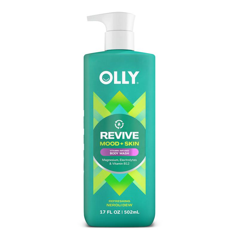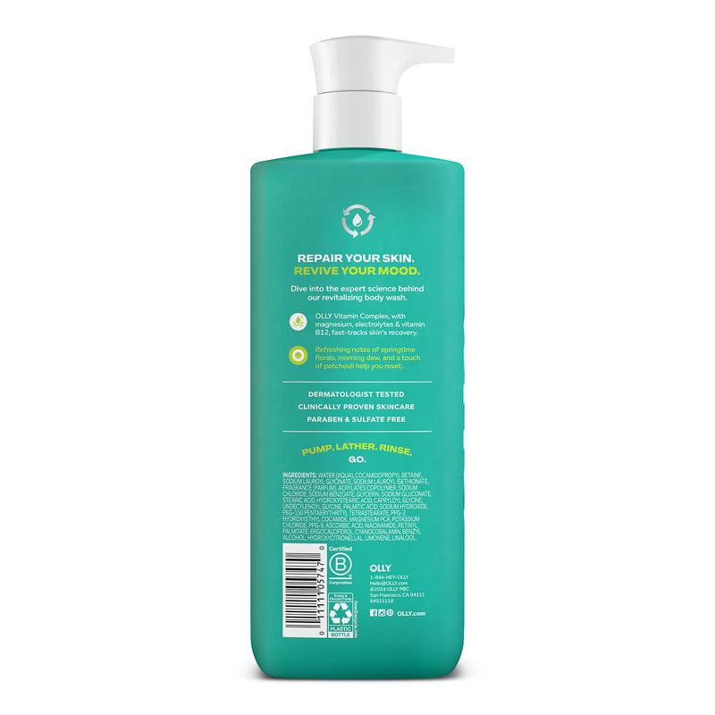 Meet OLLY REVIVE Mood + Skin Body Wash, a vitamin-infused, non-stripping gel cleanser to revive tired skin and rejuvenate your mood.Clinically proven OLLY Vitamin Complex, infused with electrolytes, magnesium, and Vitamin B12, fast-tracks your skin barrier's recovery, repairing tired skin, while refreshing notes of springtime neroli florals, green dew, and a touch of patchouli help you reset.