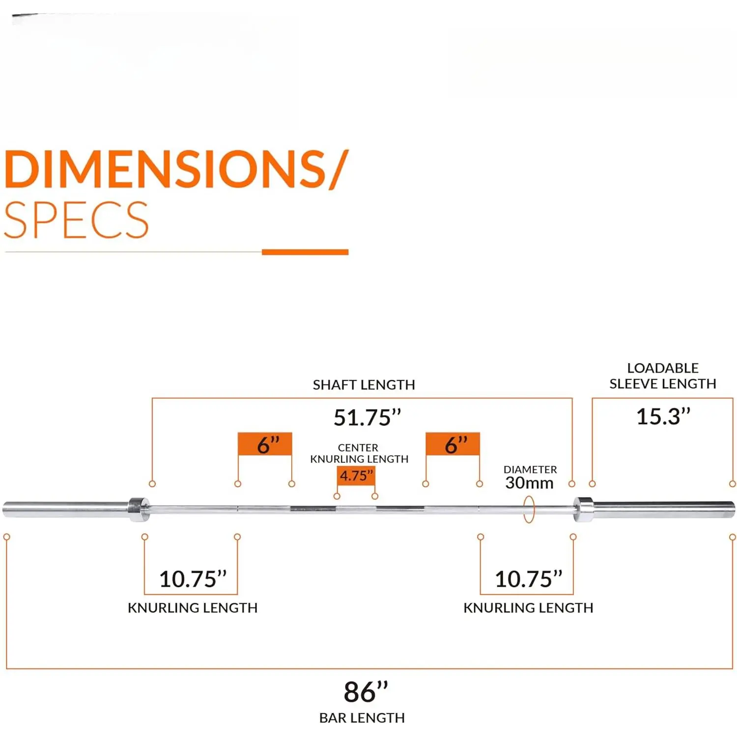 ·✔️SPECS – Measures 2185mm in length; Shaft length of 51.75"; Loadable sleeve length of 15.3"; Handgrip diameter of 30mm; 63,800 PSI tensile strength steel; Weighs 20KG; Center knurl 4.75"; Side knurling 10.75"