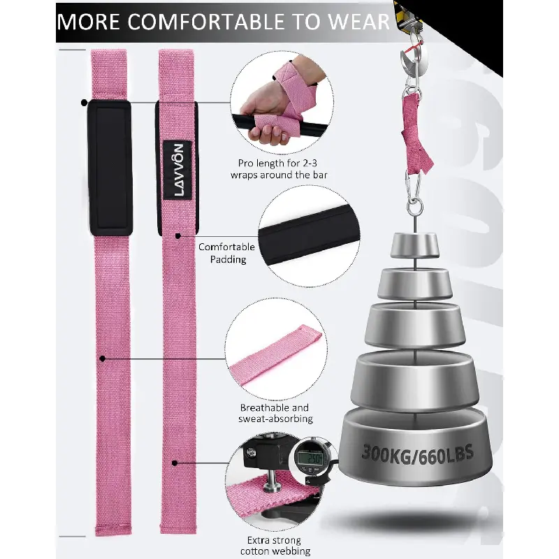 Constructed with reinforced double cross stitching to withstand well over 300kg/660lbs and made to last, the LAVVON lifting straps boast of ultra durability and help improve weightlifting performance noticably.The incredible stability they provide serves well to prevent any risk of injury due to sudden and heavy impact or slippage during intense heavylifiting.
