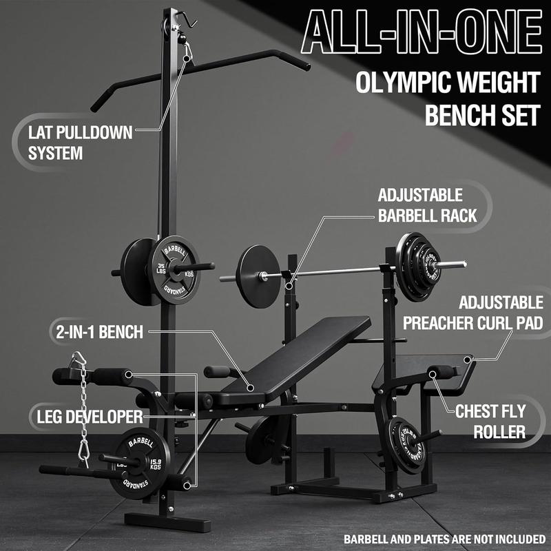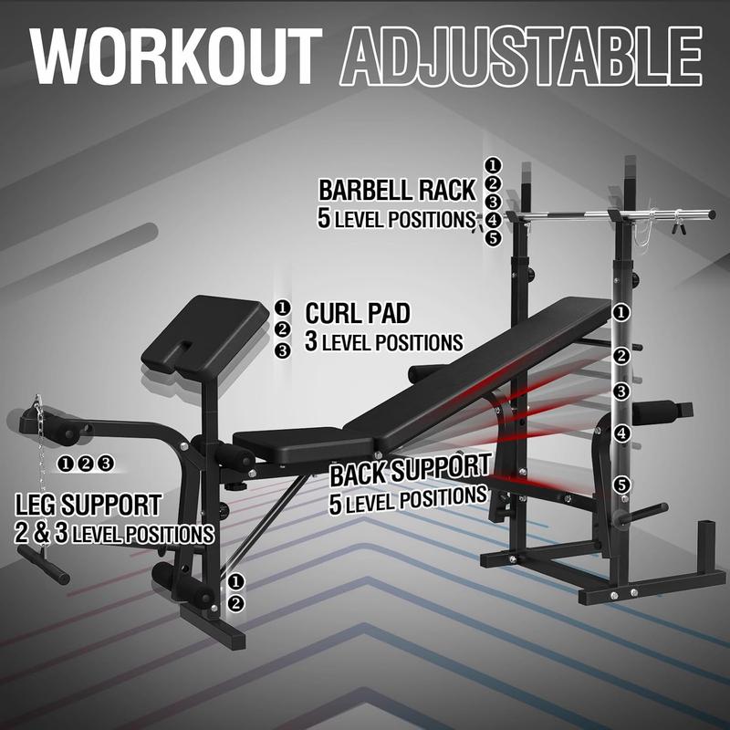 ·Multi-Function Olympic Weight Bench - OB01 base unit is a true game-changer, condensing an entire commercial gym into a single weight bench. It offers an adjustable leg developer, adjustable barbell rack, 2-in-1 weight bench, adjustable preacher curl pad, chest fly machine, and lat pulldown machine, making it a true all-rounder for your home gym