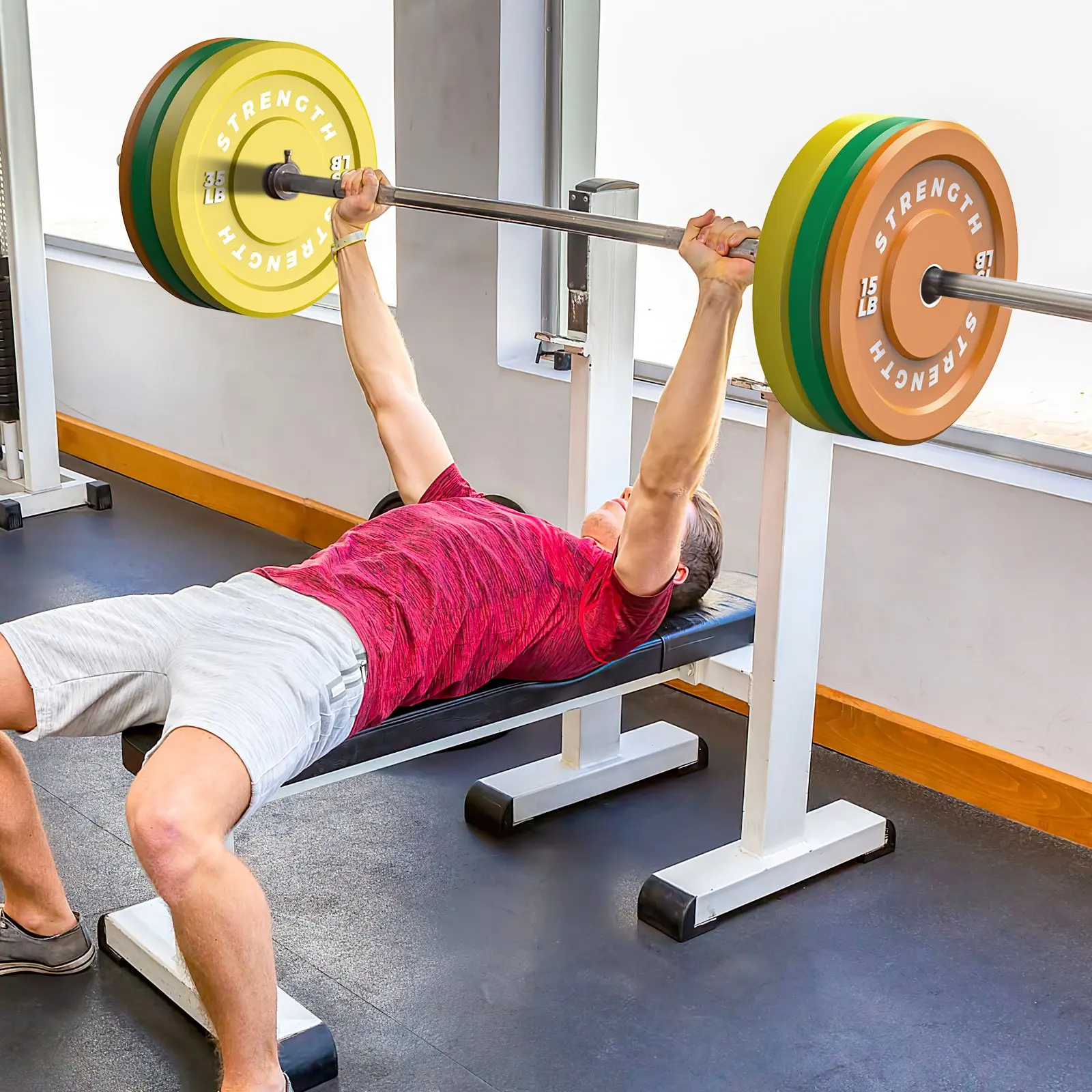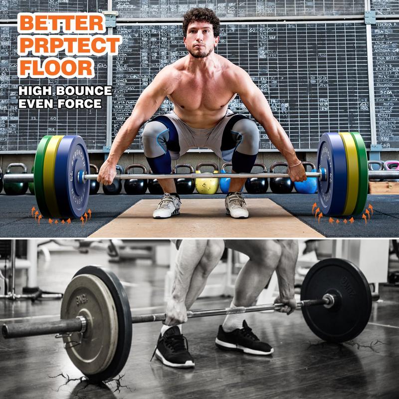 Floor Protection: Bouncy rubber plates allow you to drop a fully loaded barbell without damaging your equipment or floor. They are soft enough to eliminate the reverberating clang of steel.